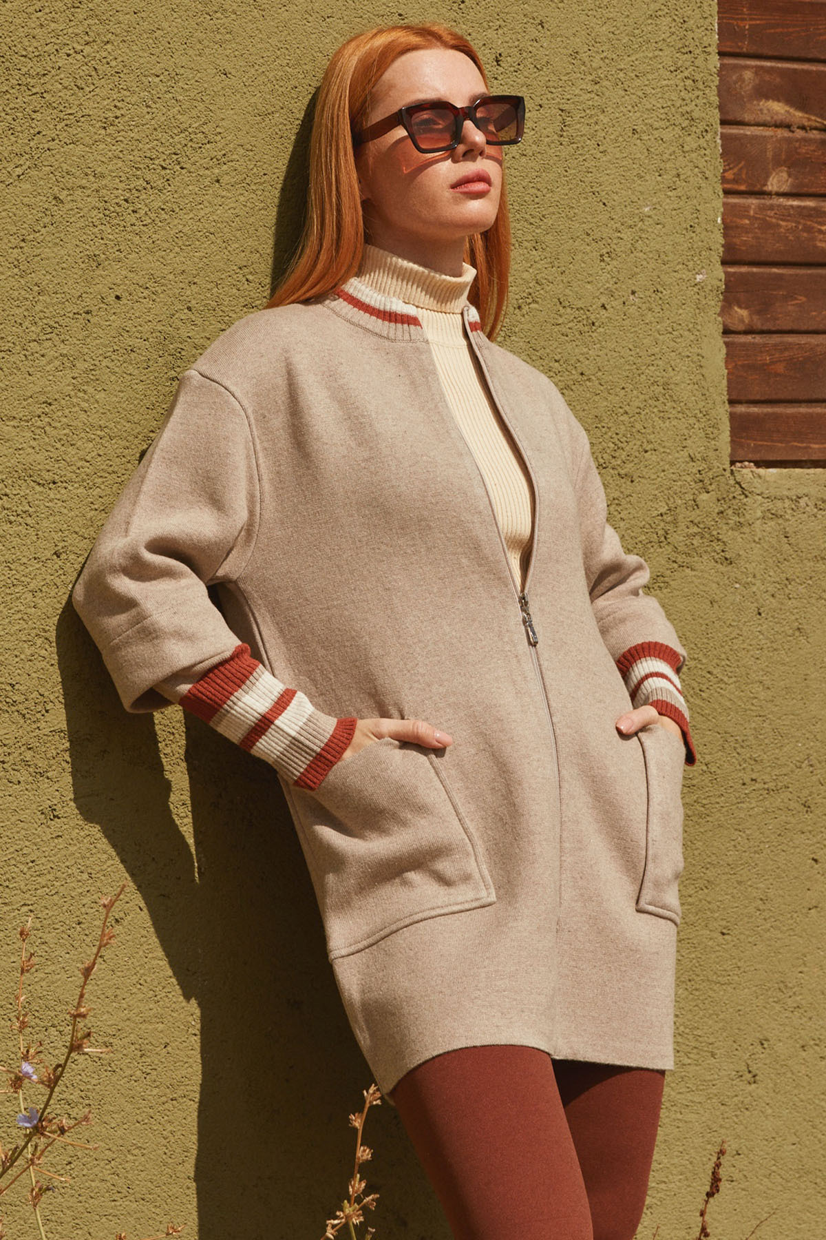 Çelik Örgü Çizgi Detaylı Triko Ceket - Vizon Çelik Örgü Çizgi Detaylı Triko Ceket - Vizon 23K2104-34438.0001 M