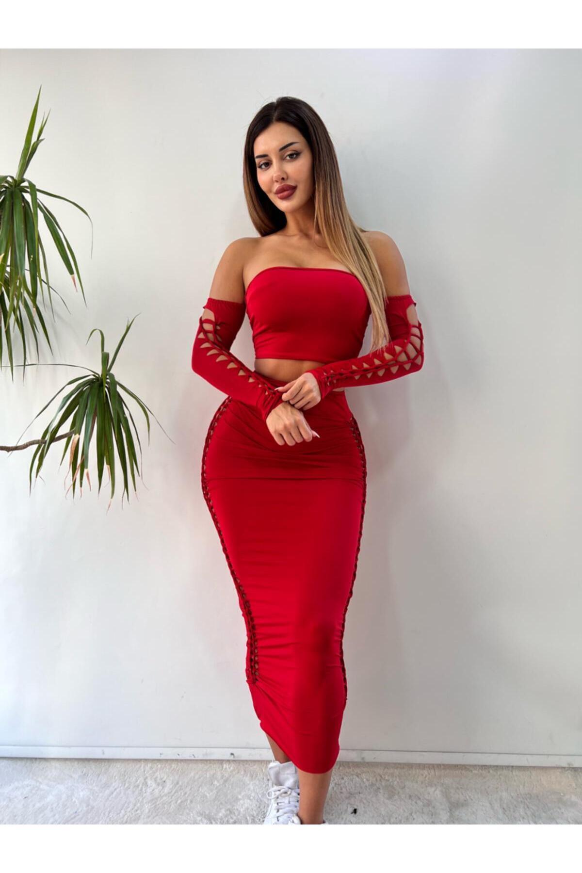 Kırmızı Lazer Kesim Detaylı Ikili Uzun Takım Kırmızı Lazer Kesim Detaylı Ikili Uzun Takım PL2061 L
