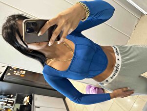 Kadın Saks Kare Yaka Uzun Kol Korse Görünümlü Biyeli Fitilli Crop Bluz Kadın Saks Kare Yaka Uzun Kol Korse Görünümlü Biyeli Fitilli Crop Bluz QTT156 L