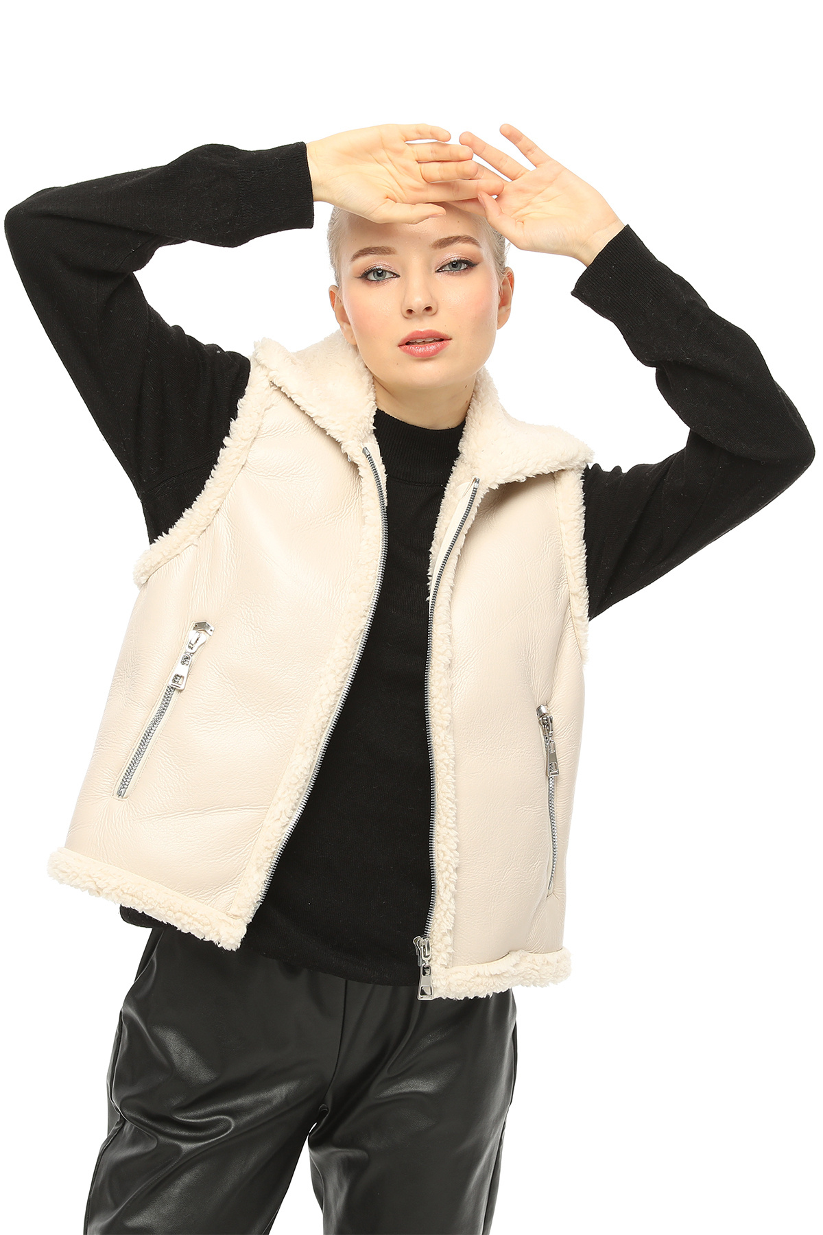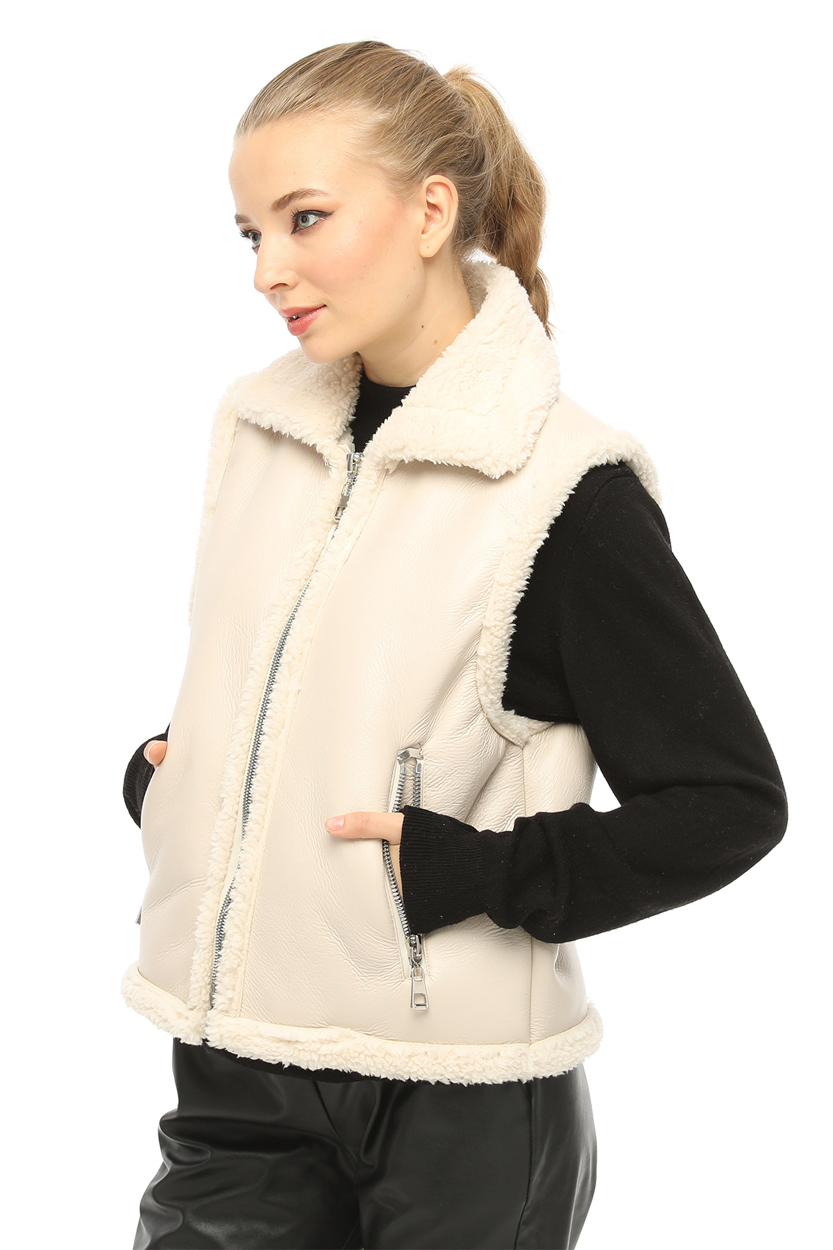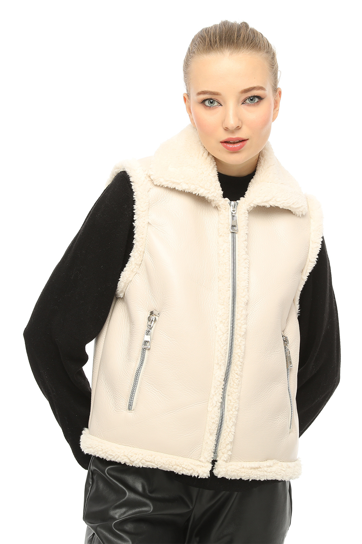 Suni Deri Kürklü Fermuarlı Krem Kadın Yelek Suni Deri Kürklü Fermuarlı Krem Kadın Yelek 56-23K-0019 XL
