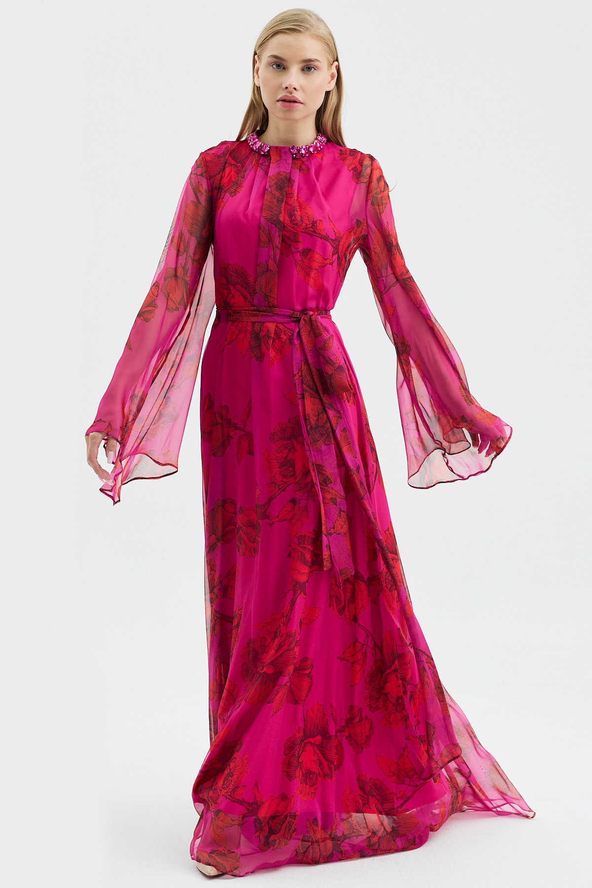 Uzun kollu dantel kombinli şifon elbise Uzun kollu dantel kombinli şifon elbise 6990 4