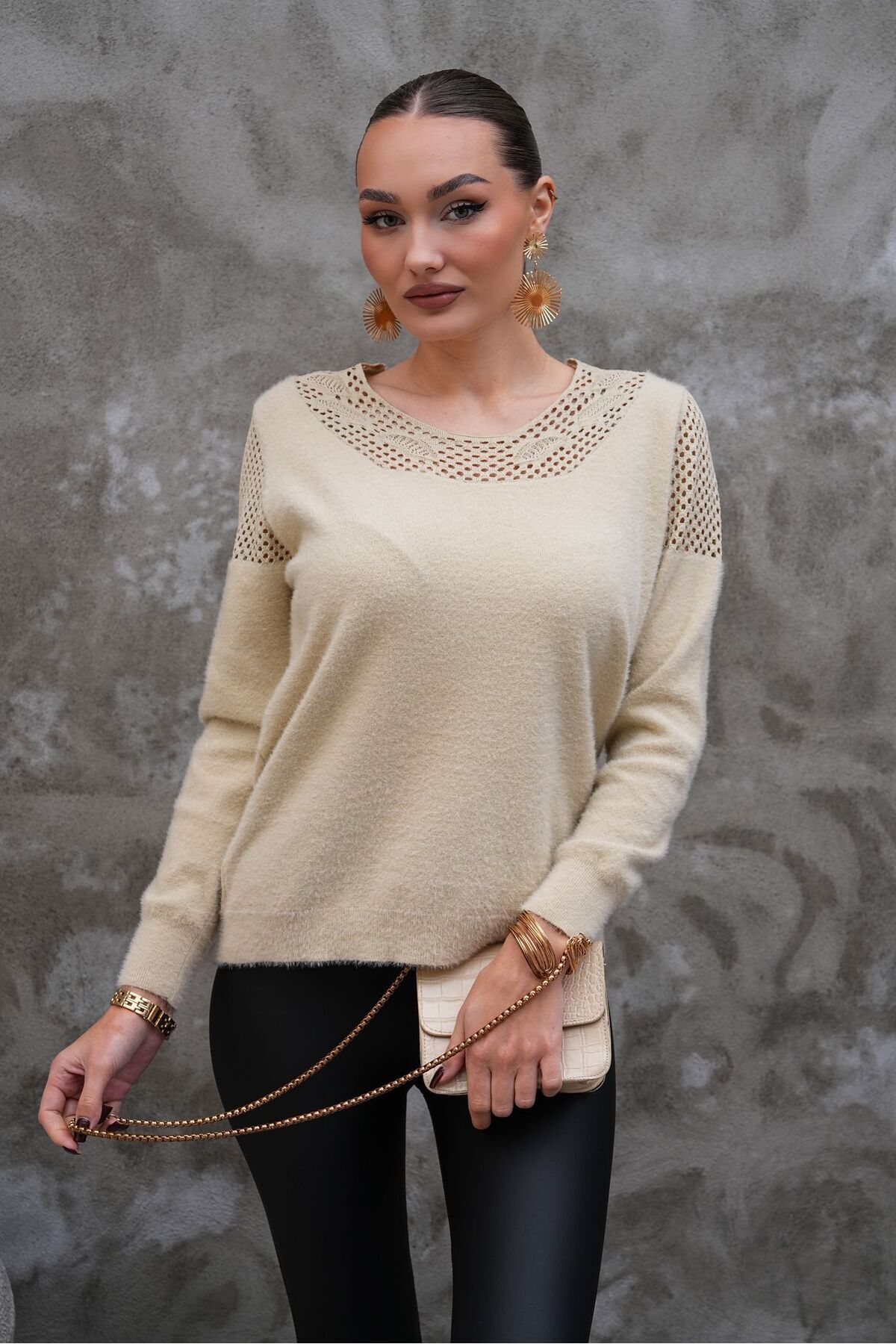Yarım Boğazlı Dik Yaka Delikli Dantelli Uzun Kol Fırfırlı Manşetli Rahat Kalıp Esnek Triko Kazak Yarım Boğazlı Dik Yaka Delikli Dantelli Uzun Kol Fırfırlı Manşetli Rahat Kalıp Esnek Triko Kazak MKBL-1359 2XL