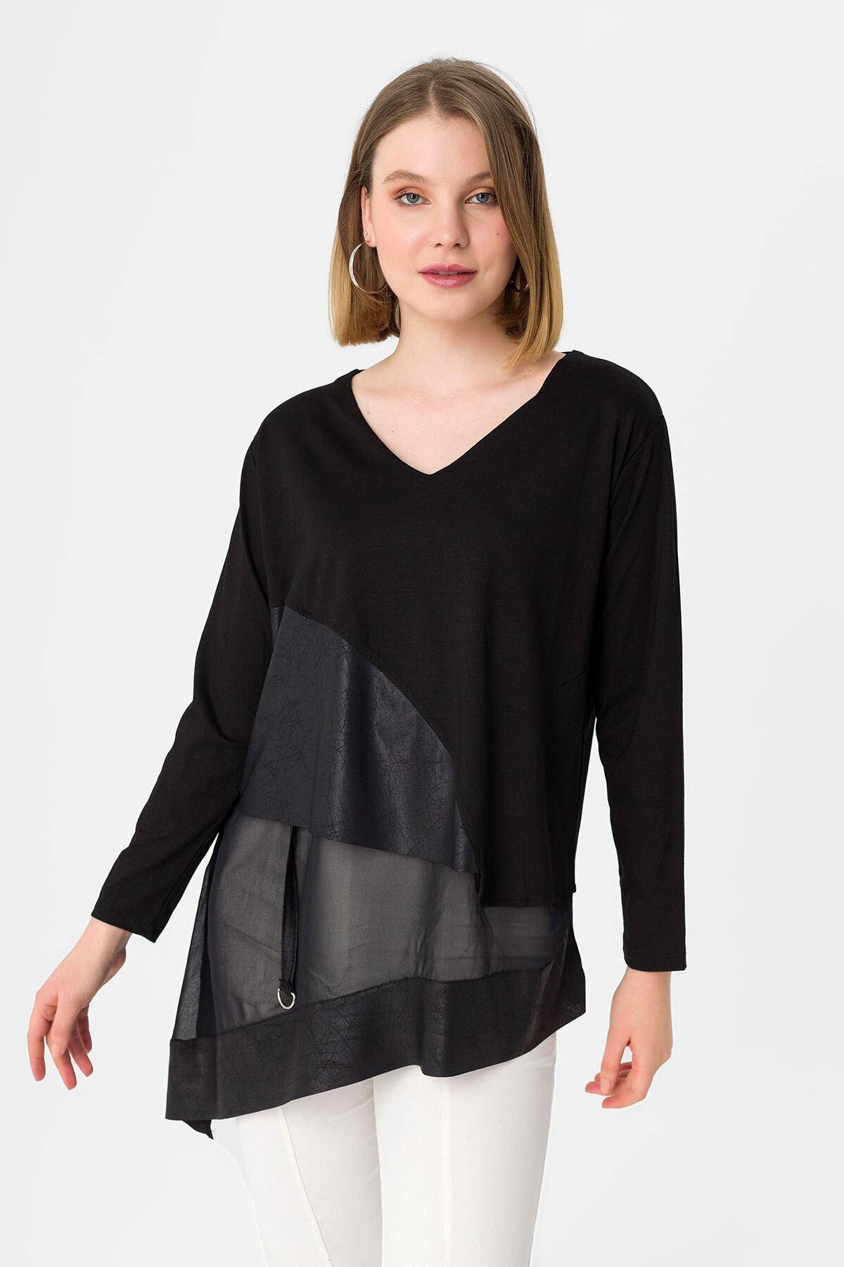 Kadın Siyah Yanı Fermuarlı Suni Deri Detaylı Bluz Kadın Siyah Yanı Fermuarlı Suni Deri Detaylı Bluz 800133 2XL