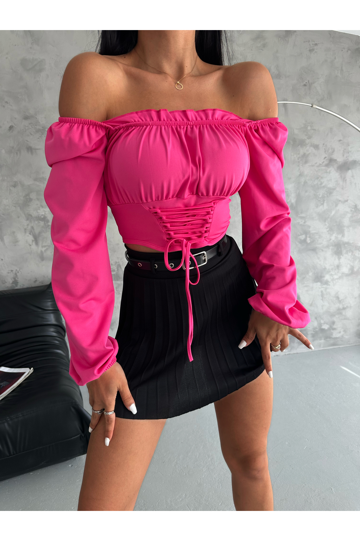 Kadın Siyah Balon Kol Bağlamalı Korse Görünümlü Madonna Yaka Dalgıç Kumaş Crop Bluz Kadın Siyah Balon Kol Bağlamalı Korse Görünümlü Madonna Yaka Dalgıç Kumaş Crop Bluz QTT172 L