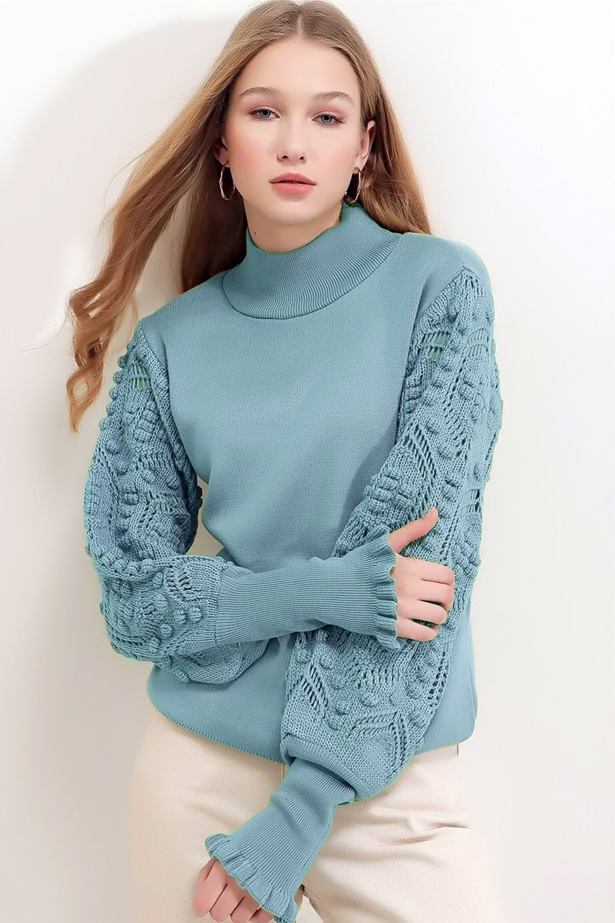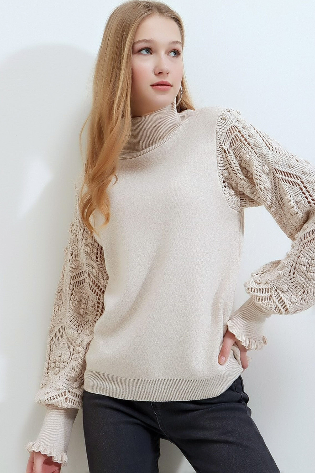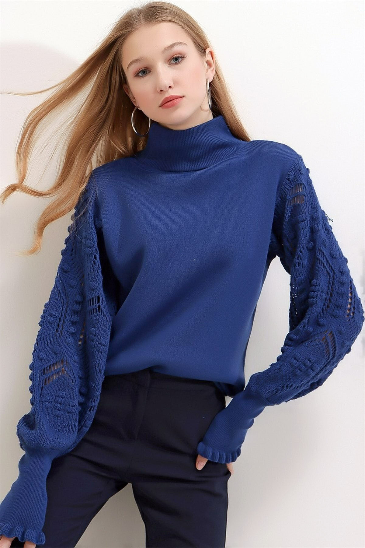 Kadın Yarım Boğazlı Delikli Dantel Görüümlü Uzun Kol Fırfırlı Manşetli Esnek Triko Kazak Kadın Yarım Boğazlı Delikli Dantel Görüümlü Uzun Kol Fırfırlı Manşetli Esnek Triko Kazak NLRU-1359 2XL