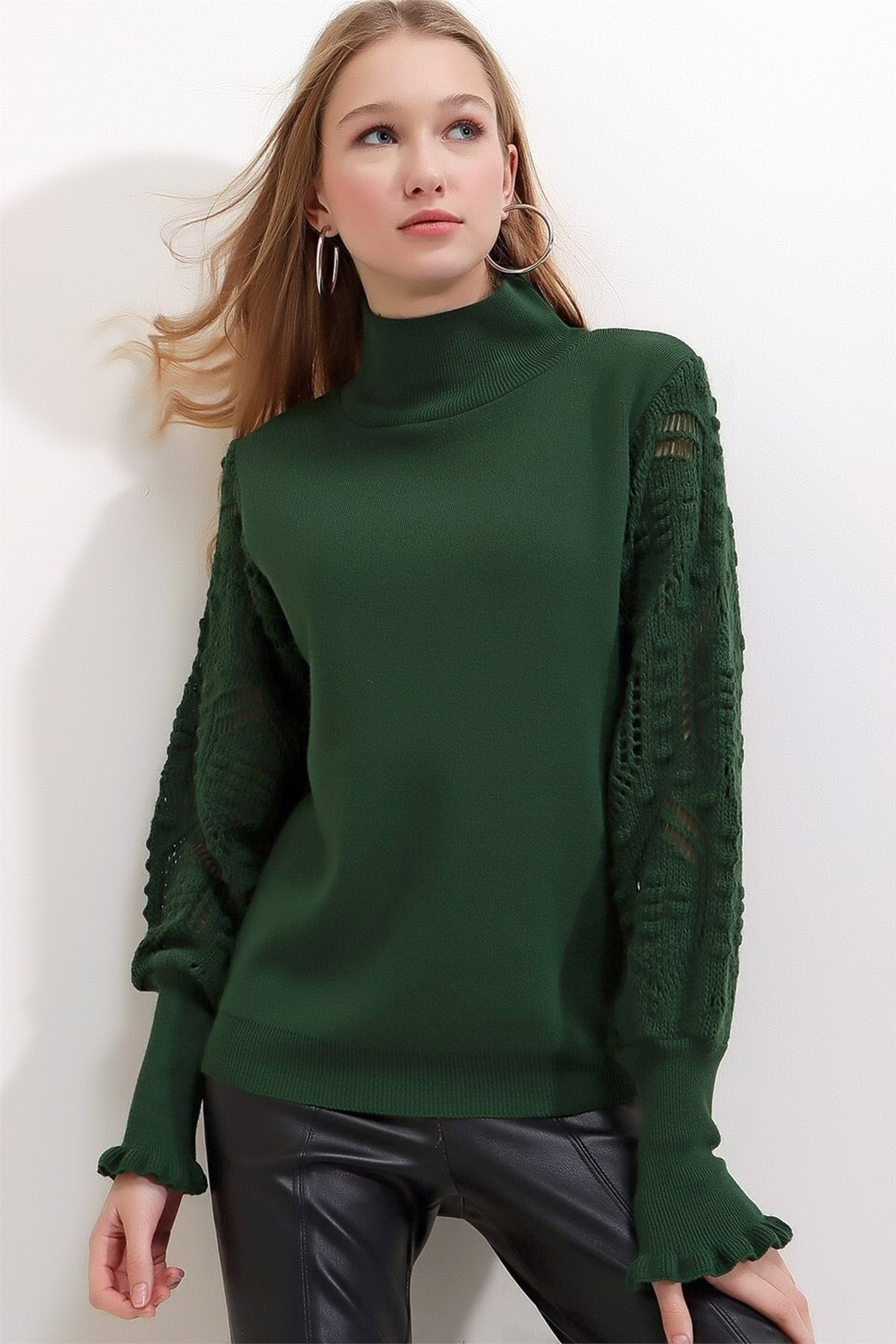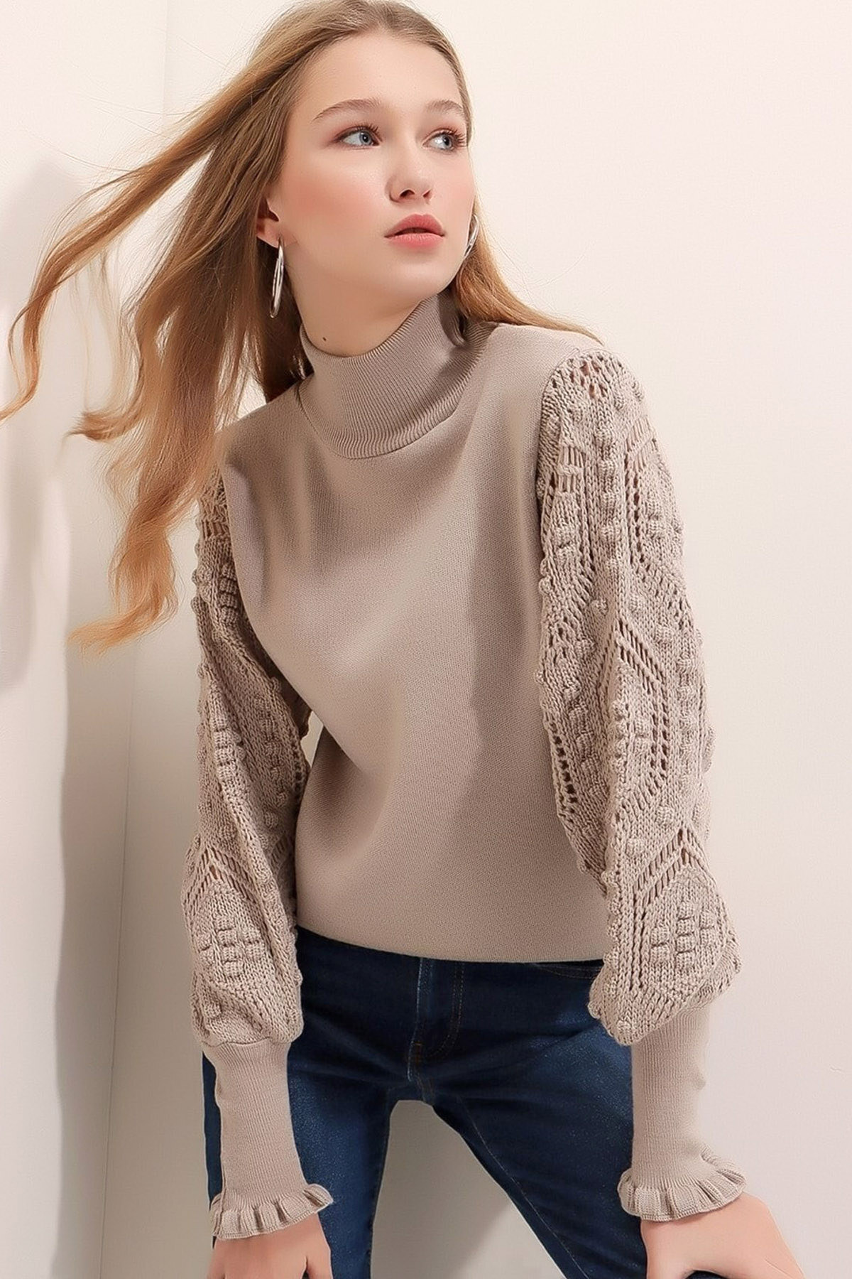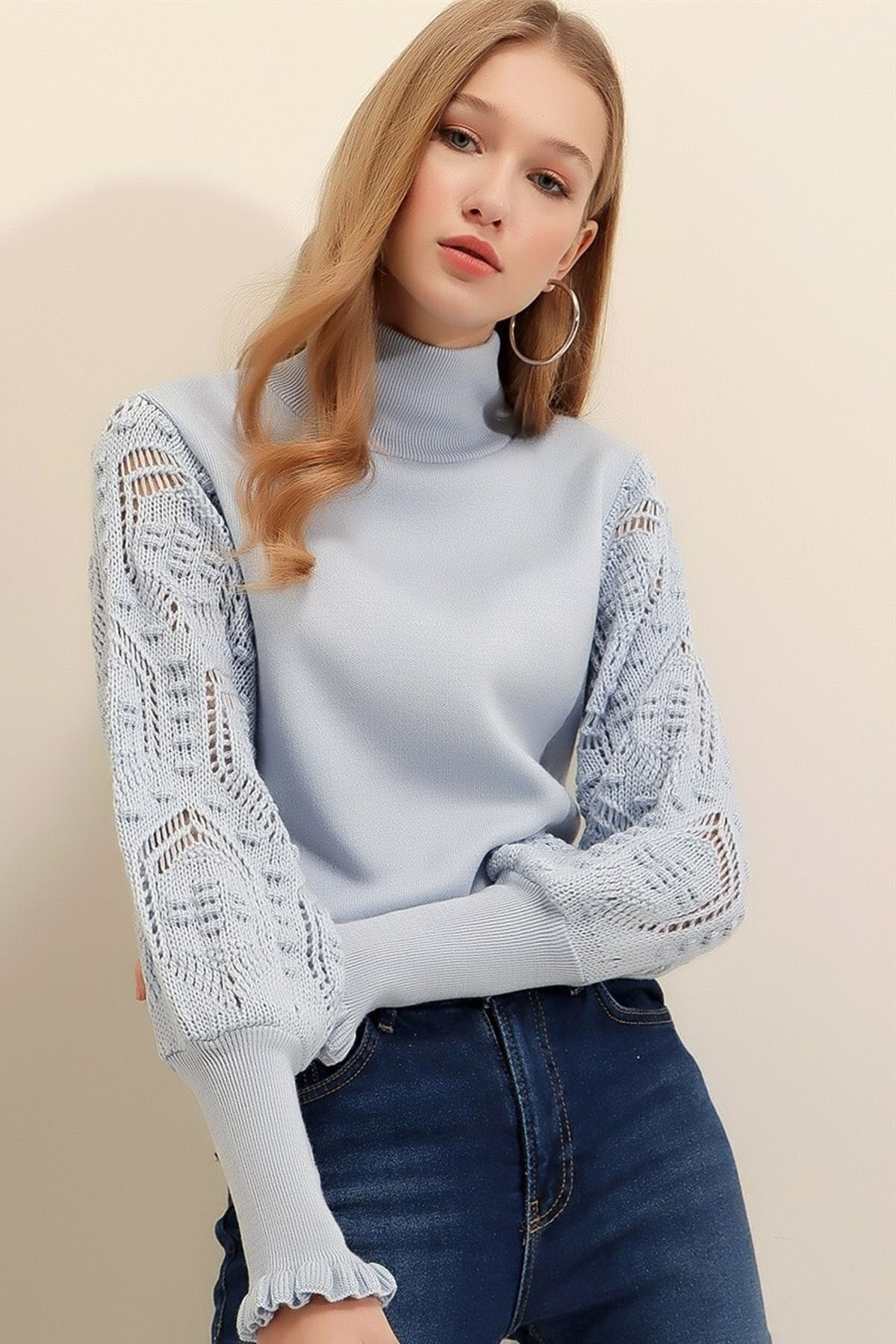 Kadın Yarım Boğazlı Delikli Dantel Görüümlü Uzun Kol Fırfırlı Manşetli Esnek Triko Kazak Kadın Yarım Boğazlı Delikli Dantel Görüümlü Uzun Kol Fırfırlı Manşetli Esnek Triko Kazak NLRU-1359 2XL