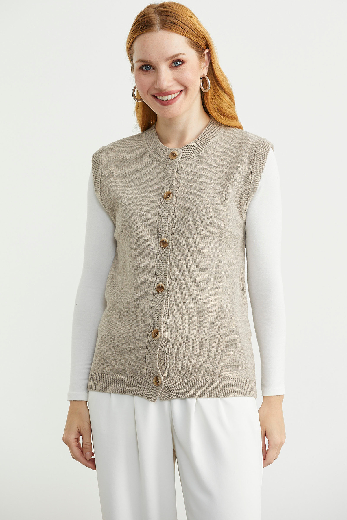 Fermuarlı Çiçek Motifli Triko Yelek - Vizon Fermuarlı Çiçek Motifli Triko Yelek - Vizon 23K2133-34466.0001 L