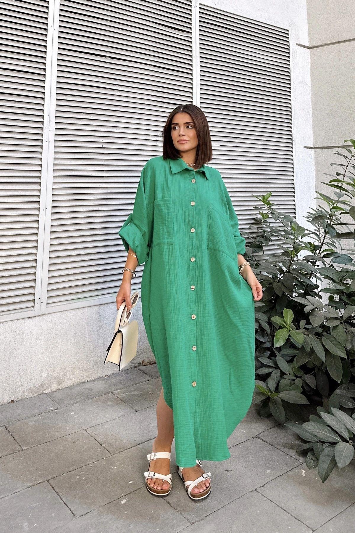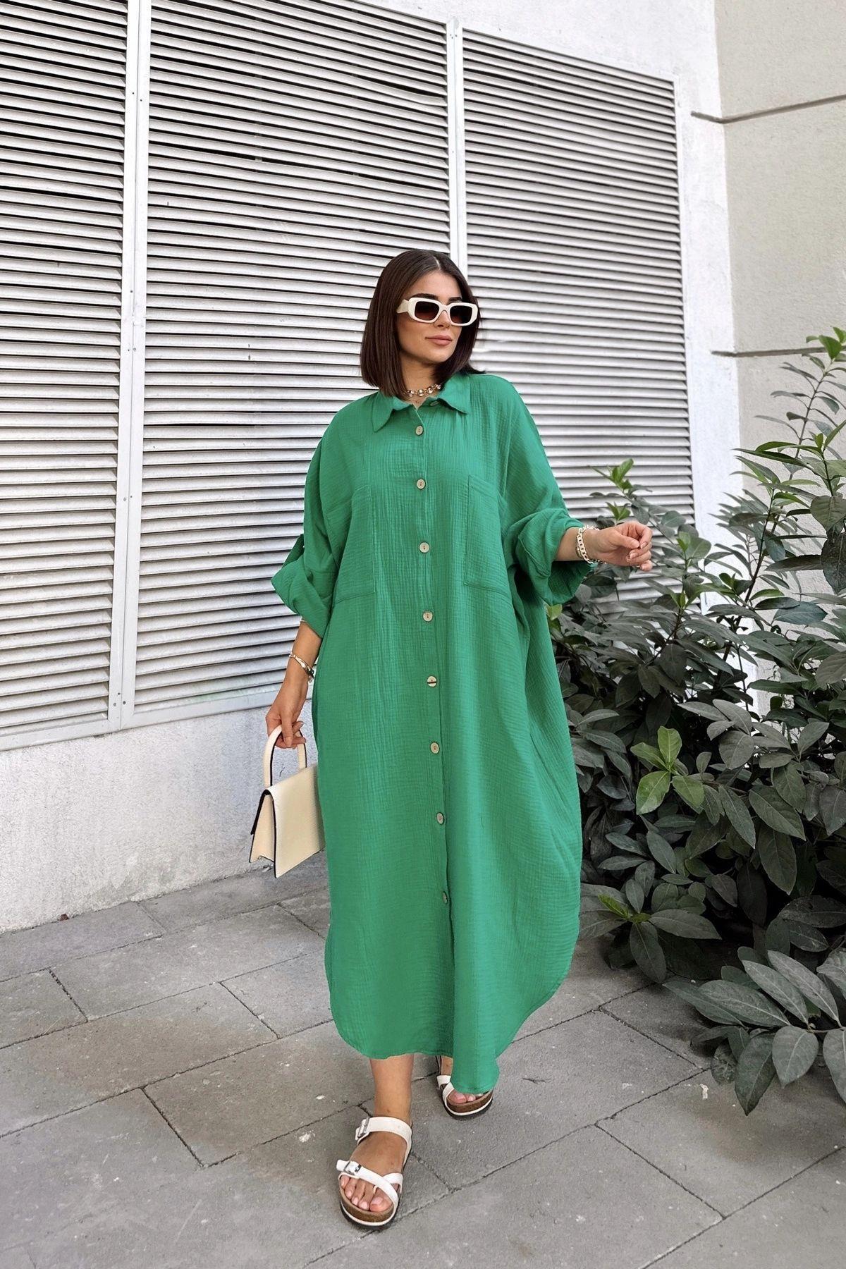 Kadın Yeşil Muslin Kumaş, Yarasa Kol, Eteği Oval, Çift Cepli, Uzun Oversize Salaş Gömlek Elbise Kadın Yeşil Muslin Kumaş, Yarasa Kol, Eteği Oval, Çift Cepli, Uzun Oversize Salaş Gömlek Elbise NY3440 42