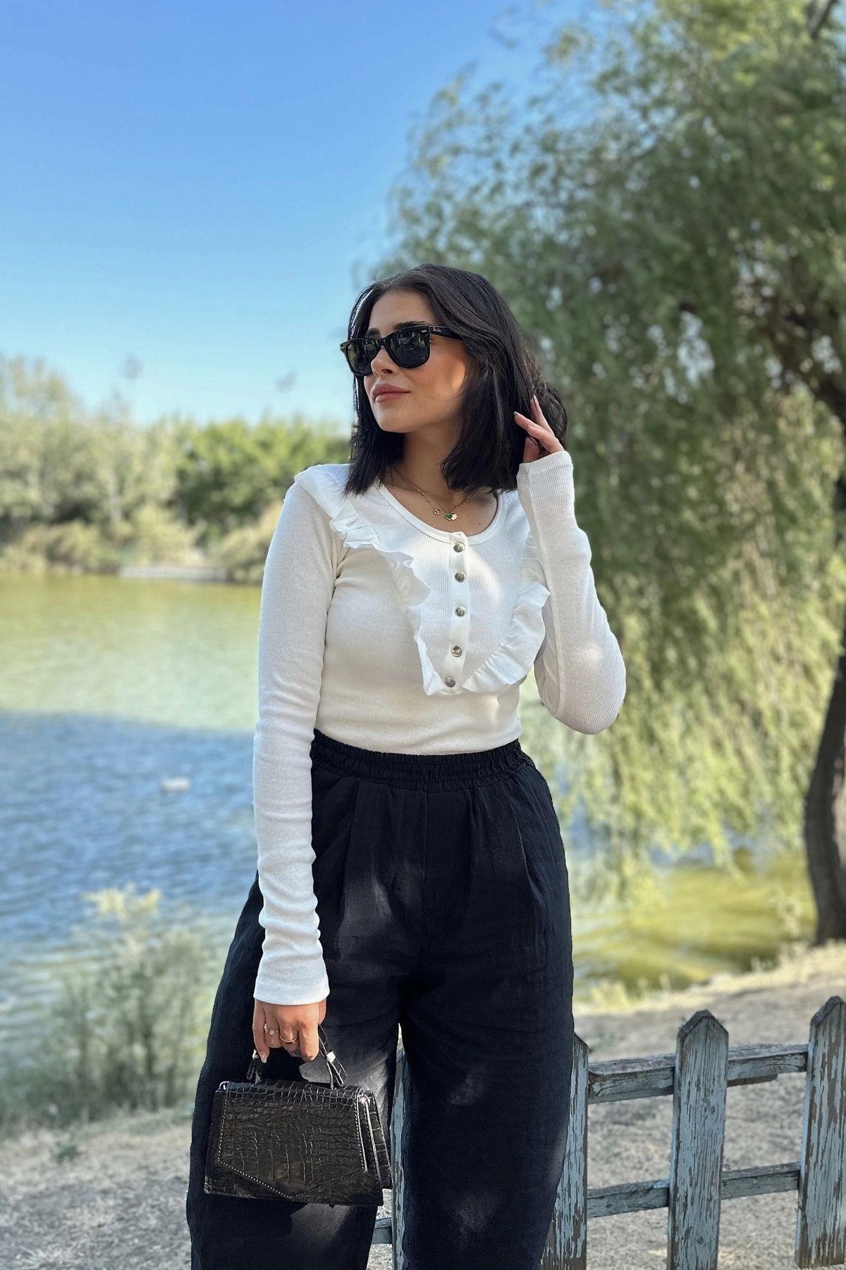 Kadın Ekru Yuvarlak Yaka, Uzun Kol, Fırfır Detaylı Yarım Patlı Çıtçıtlı Kaşkorse Bluz Kadın Ekru Yuvarlak Yaka, Uzun Kol, Fırfır Detaylı Yarım Patlı Çıtçıtlı Kaşkorse Bluz NYK7113 42