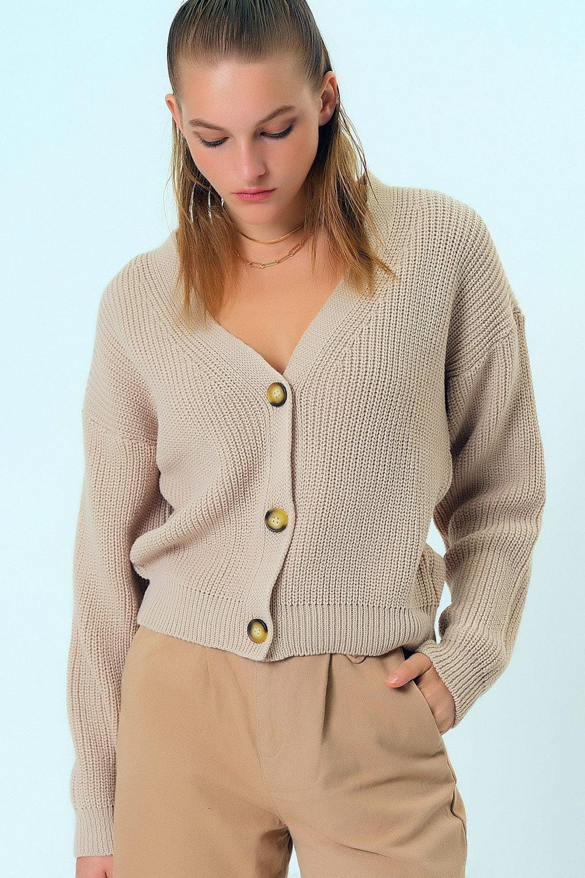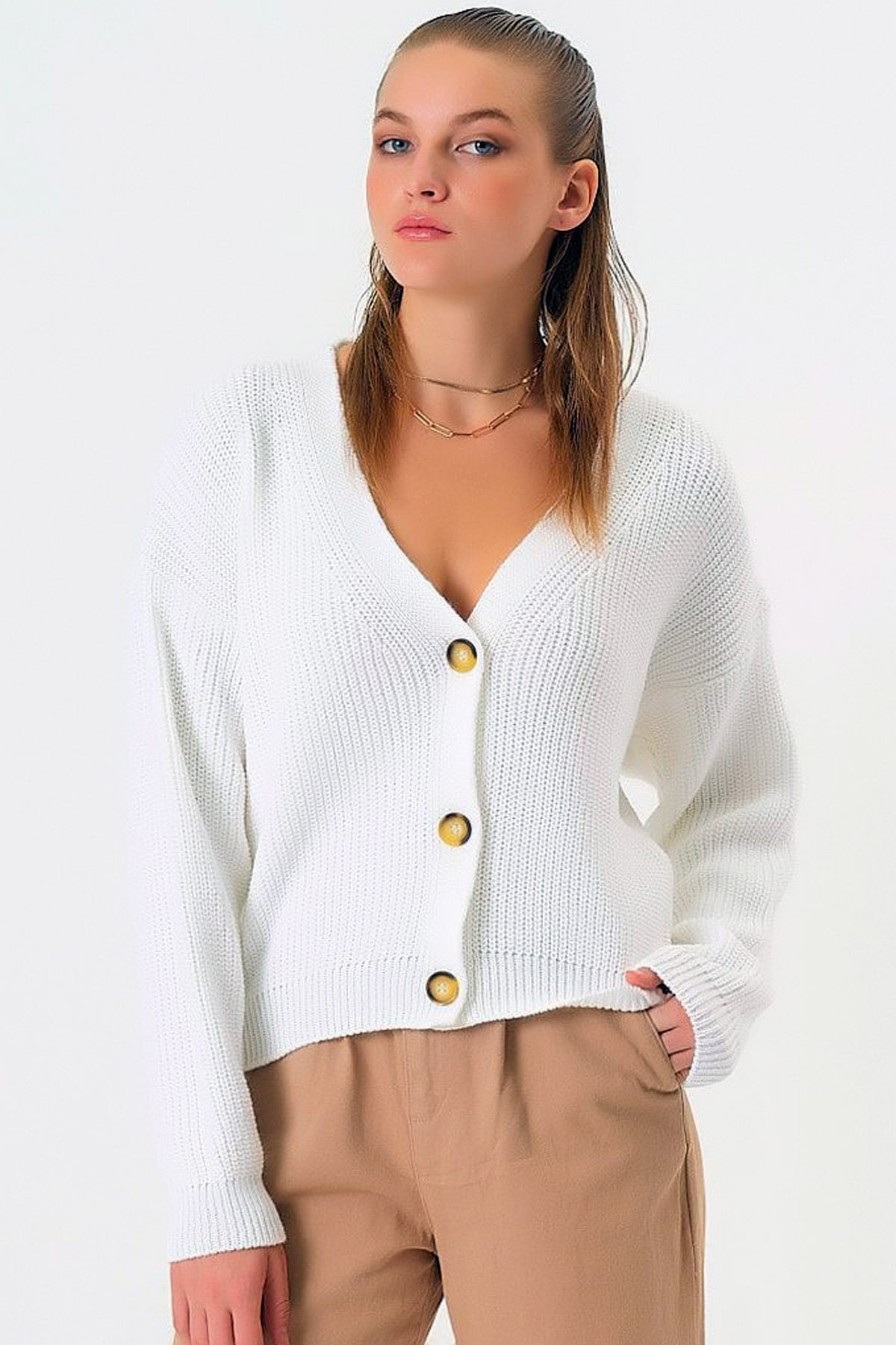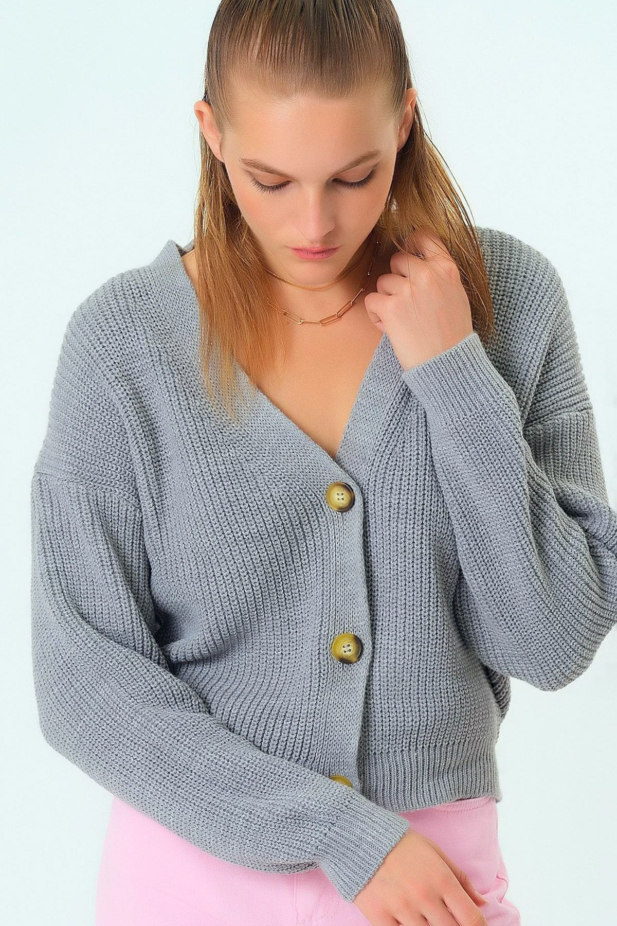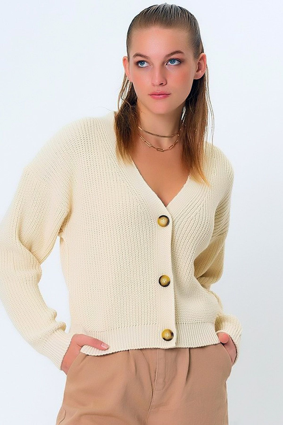 V Yakalı Uzun Kollu Düşük Omuzlu Kalın Örgü Düğme Kapamalı Bol Kalıp Tarz Sıcak Kısa Triko Hırka V Yakalı Uzun Kollu Düşük Omuzlu Kalın Örgü Düğme Kapamalı Bol Kalıp Tarz Sıcak Kısa Triko Hırka CLLK-1280 Standart