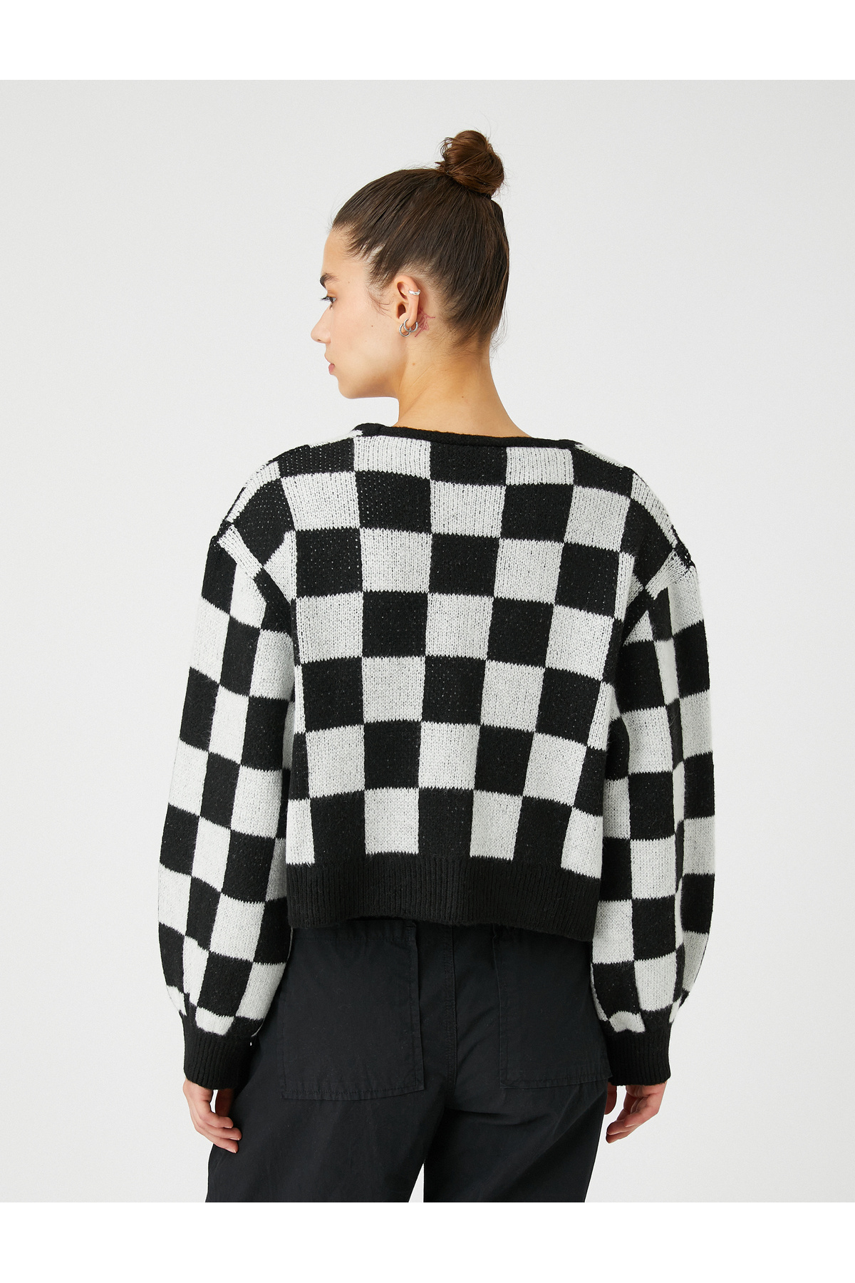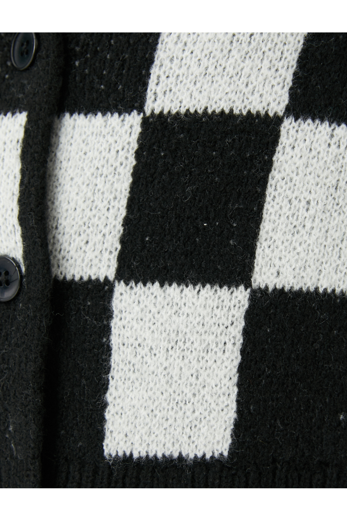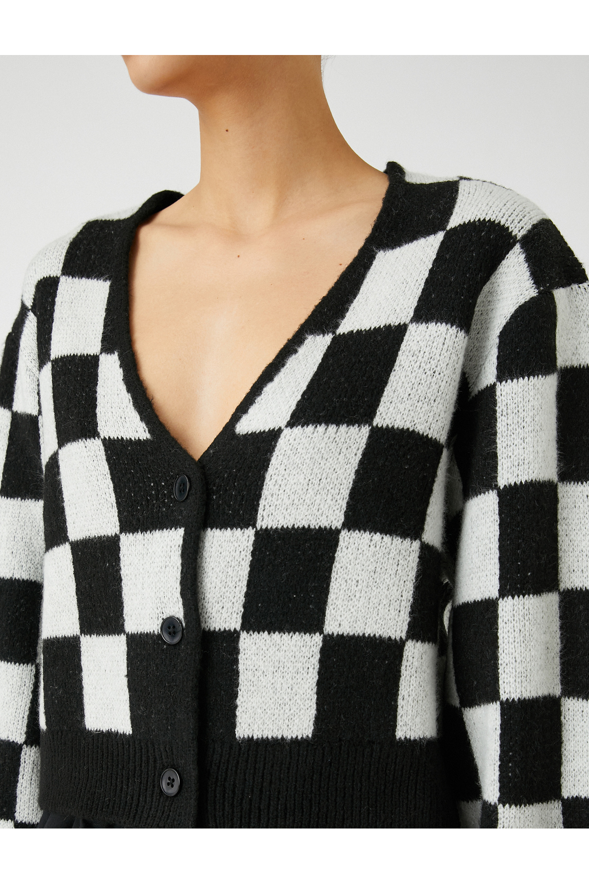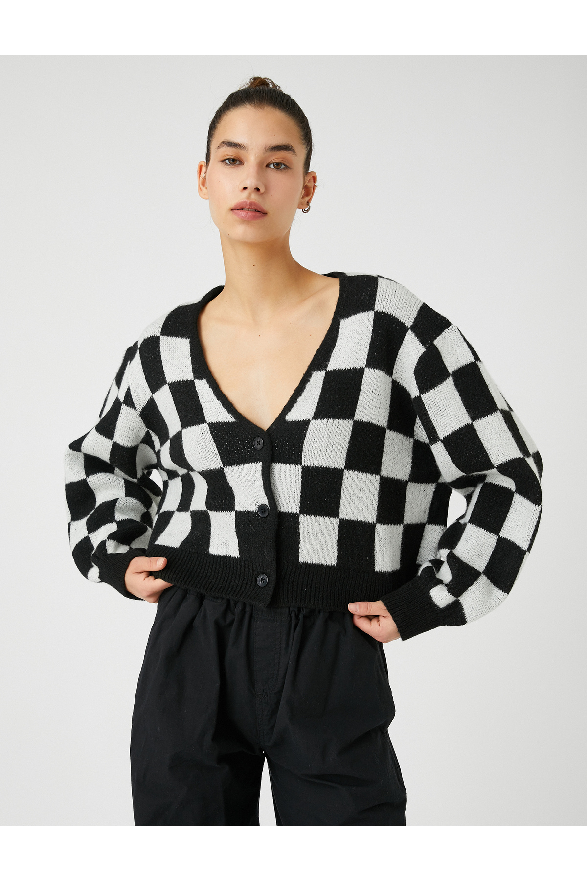 Crop Hırka Örgü V Yaka Düğmeli Dama Desenli Ribanalı Crop Hırka Örgü V Yaka Düğmeli Dama Desenli Ribanalı 4WAL90051HT L