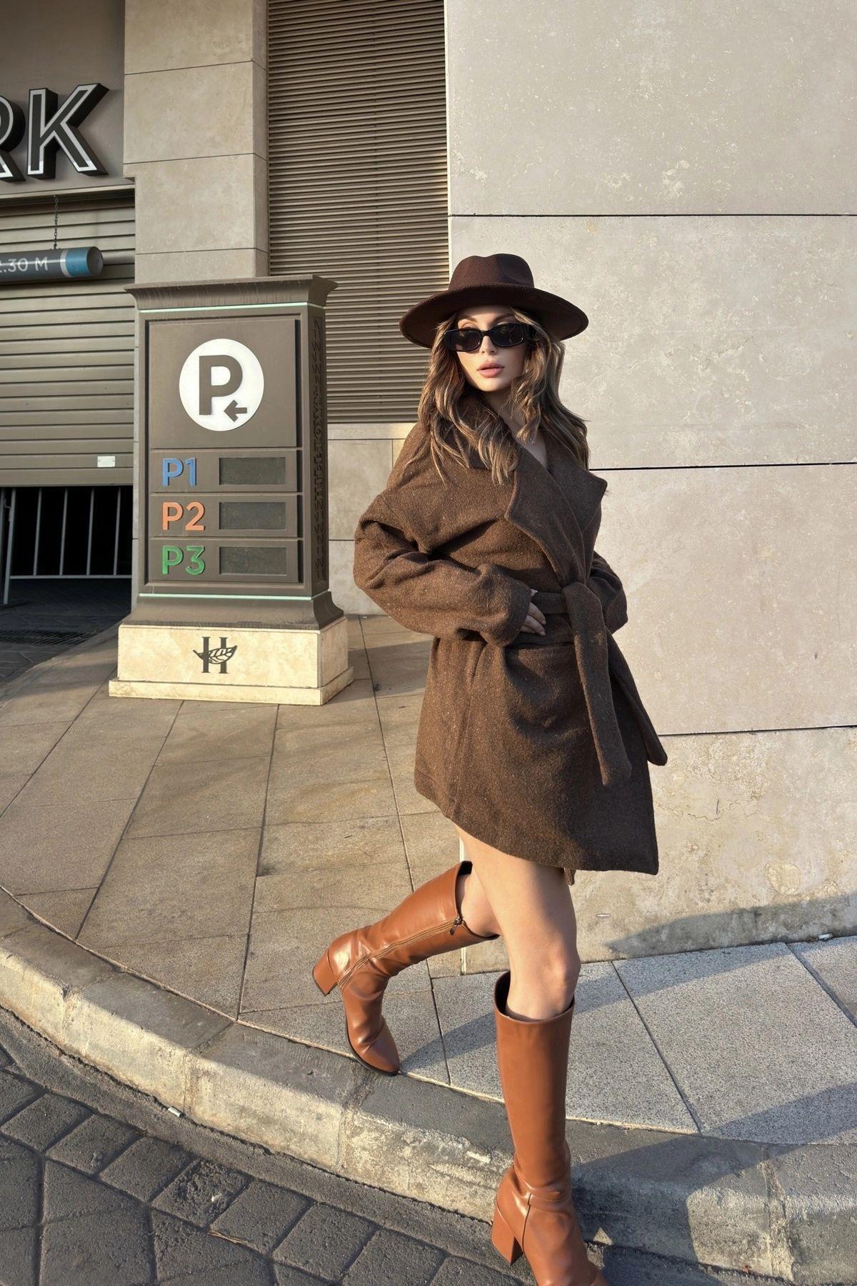 Kadın Kahve Kruvaze Yaka, Çift Cepli, Beli Kemerli, Kaşe Kaban Ceket (ASTARSIZ) Kadın Kahve Kruvaze Yaka, Çift Cepli, Beli Kemerli, Kaşe Kaban Ceket (ASTARSIZ) NY3296 42