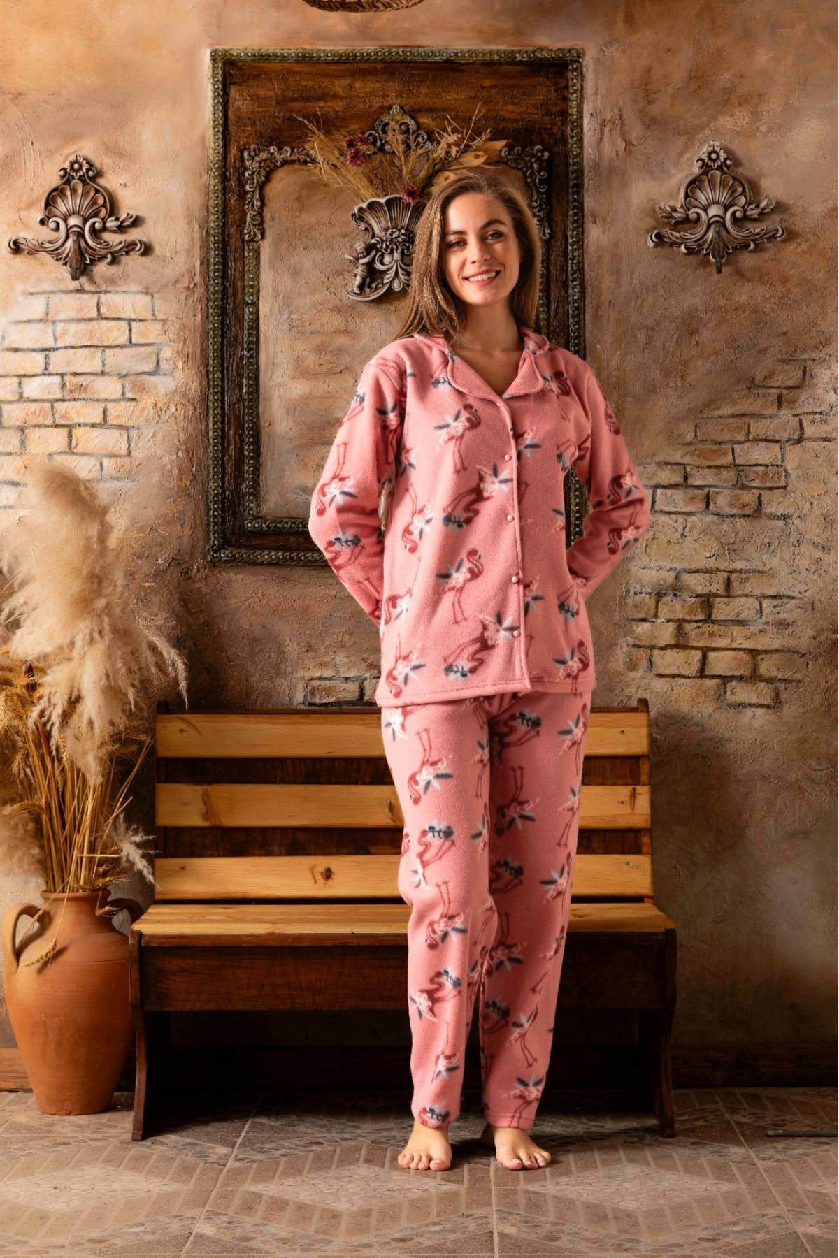 Kadın Önden Düğmeli Uzun Kollu Polar Peluş Kışlık Sıcak Tutan Pijama Takımı Kadın Önden Düğmeli Uzun Kollu Polar Peluş Kışlık Sıcak Tutan Pijama Takımı 687YP200 XL