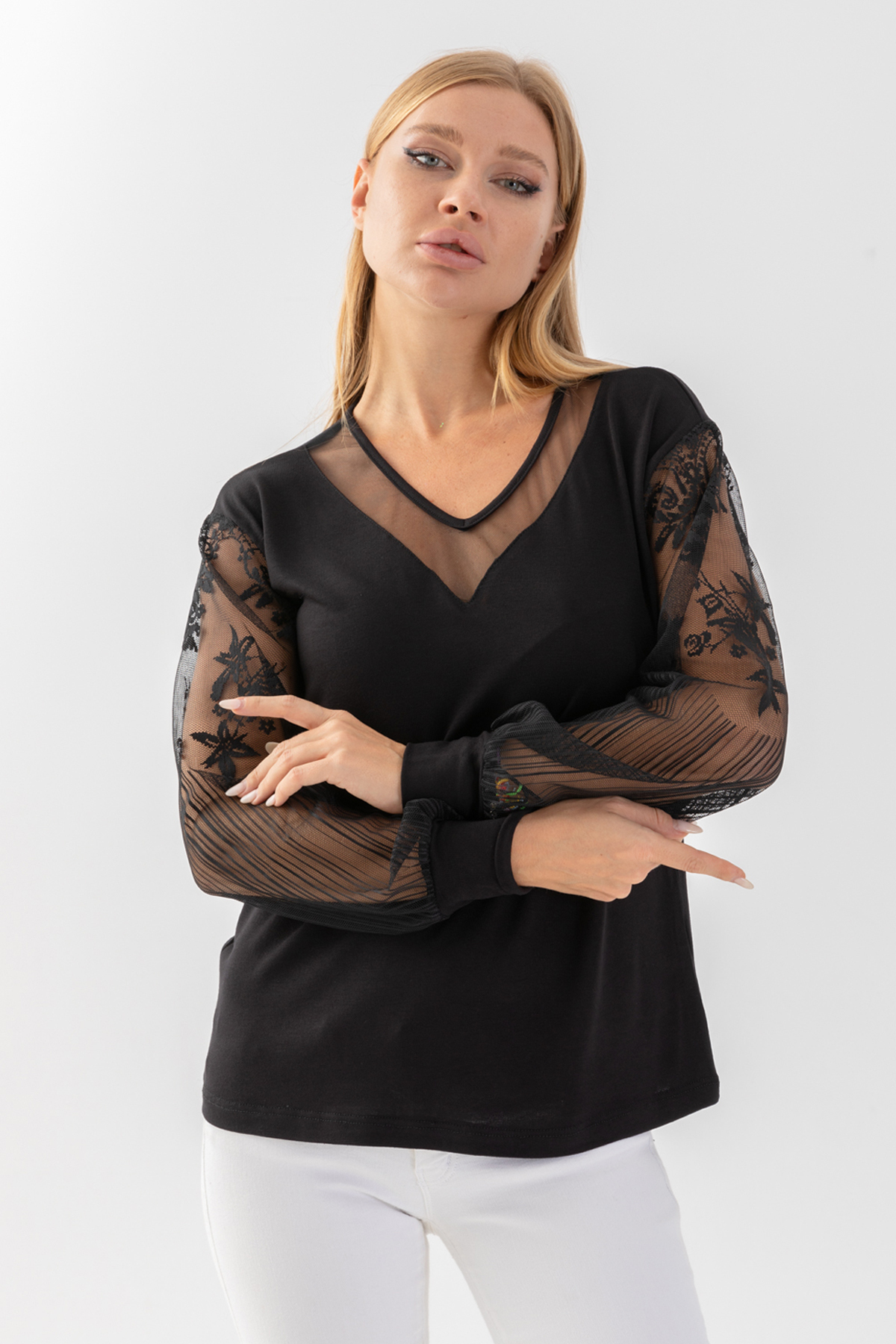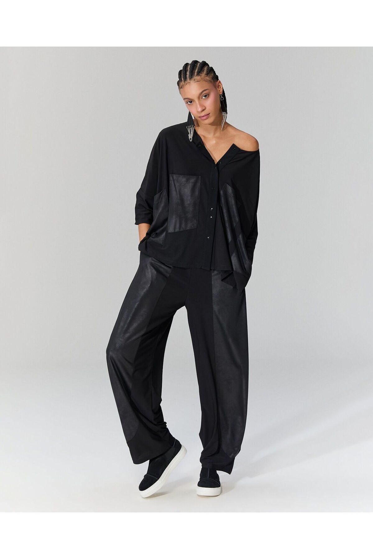 Kadın Siyah Yaksı Tül Detaylı Önü Suni Derili Eteği Aimetrik Bluz Kadın Siyah Yaksı Tül Detaylı Önü Suni Derili Eteği Aimetrik Bluz 800149 2XL