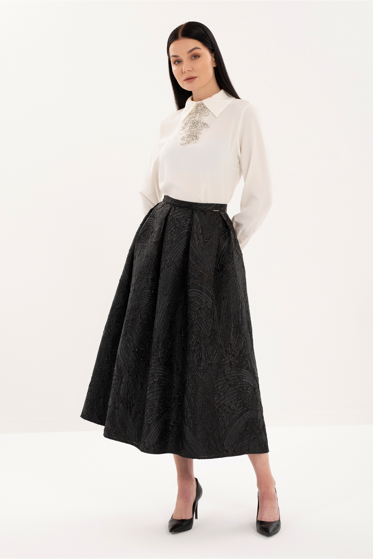 Midi Boy Desenli Simli Organze Gümüş-gri Astarlı Pileli Etek Midi Boy Desenli Simli Organze Gümüş-gri Astarlı Pileli Etek 641424 42