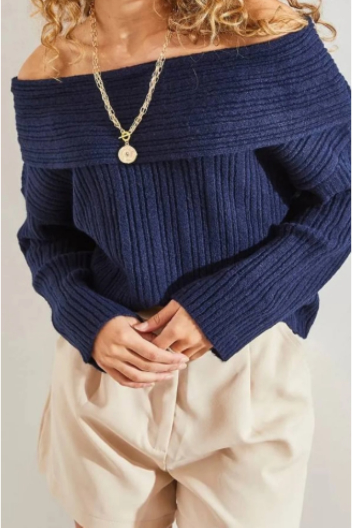 Kadın İndigo Degaje Yaka Fitilli Kazak Kadın İndigo Degaje Yaka Fitilli Kazak 518bnd Standart