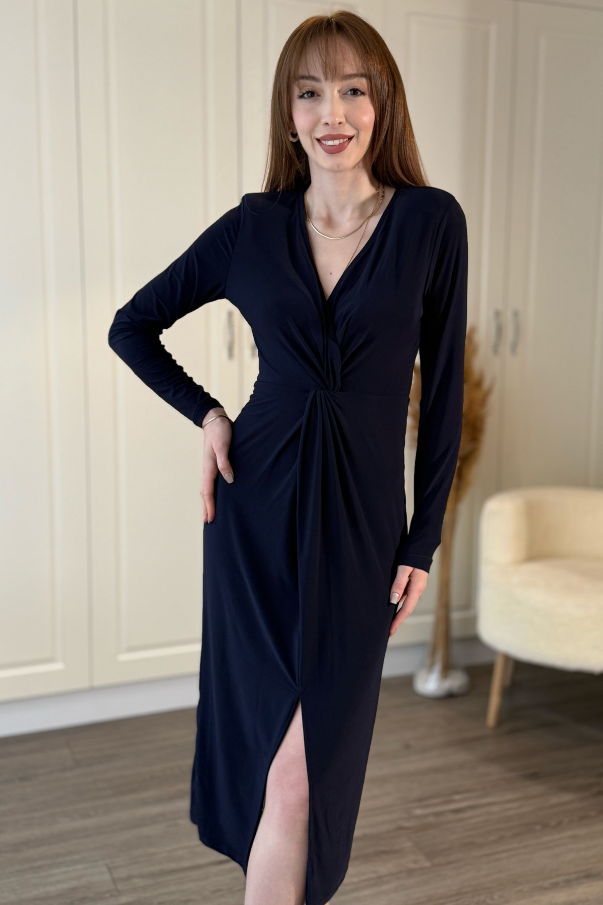 Saks Mavisi Kruvaze Yaka Kol Manşetli Midi Elbise Saks Mavisi Kruvaze Yaka Kol Manşetli Midi Elbise PPE004 XL