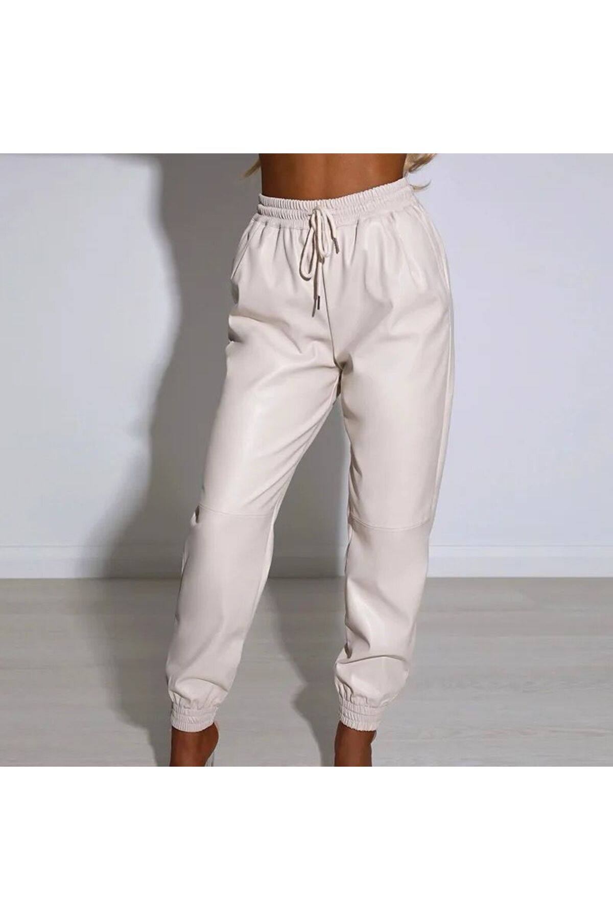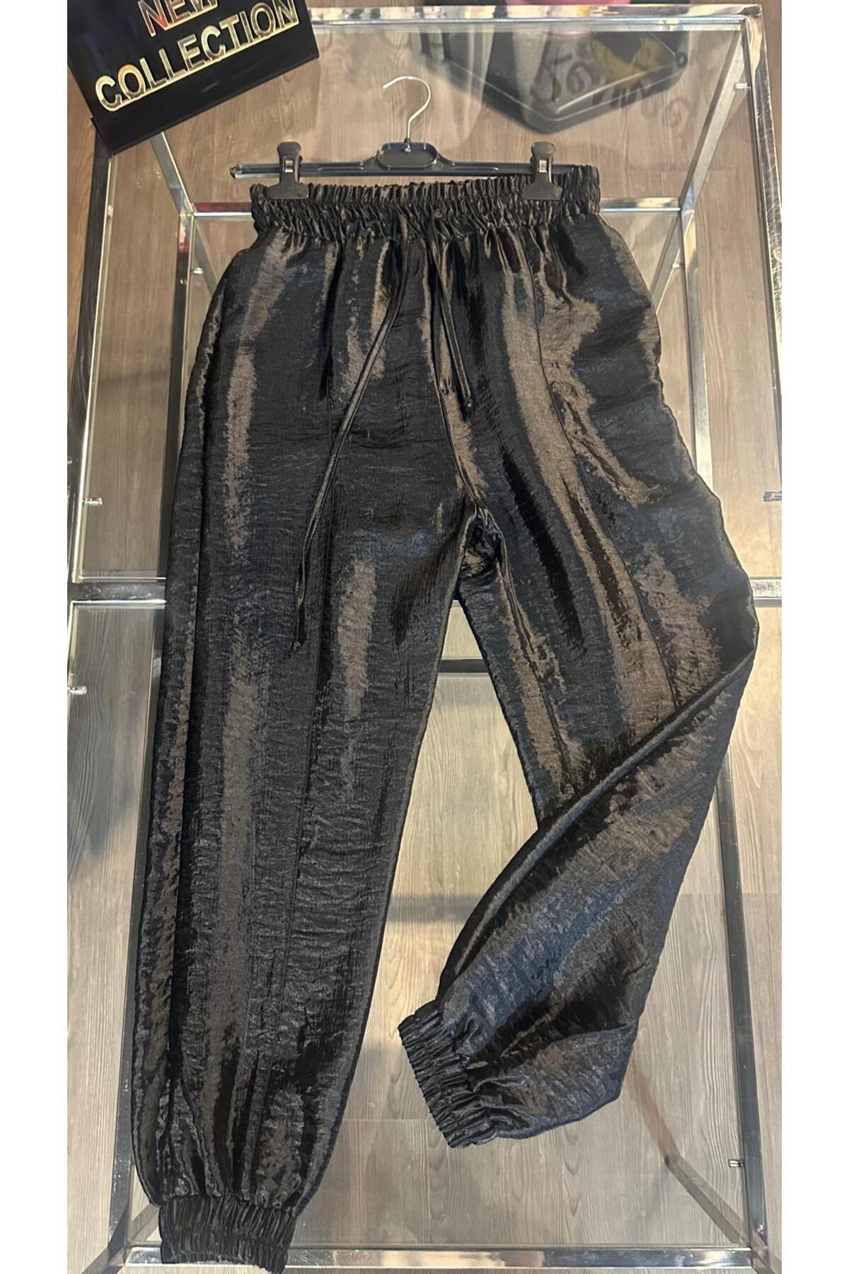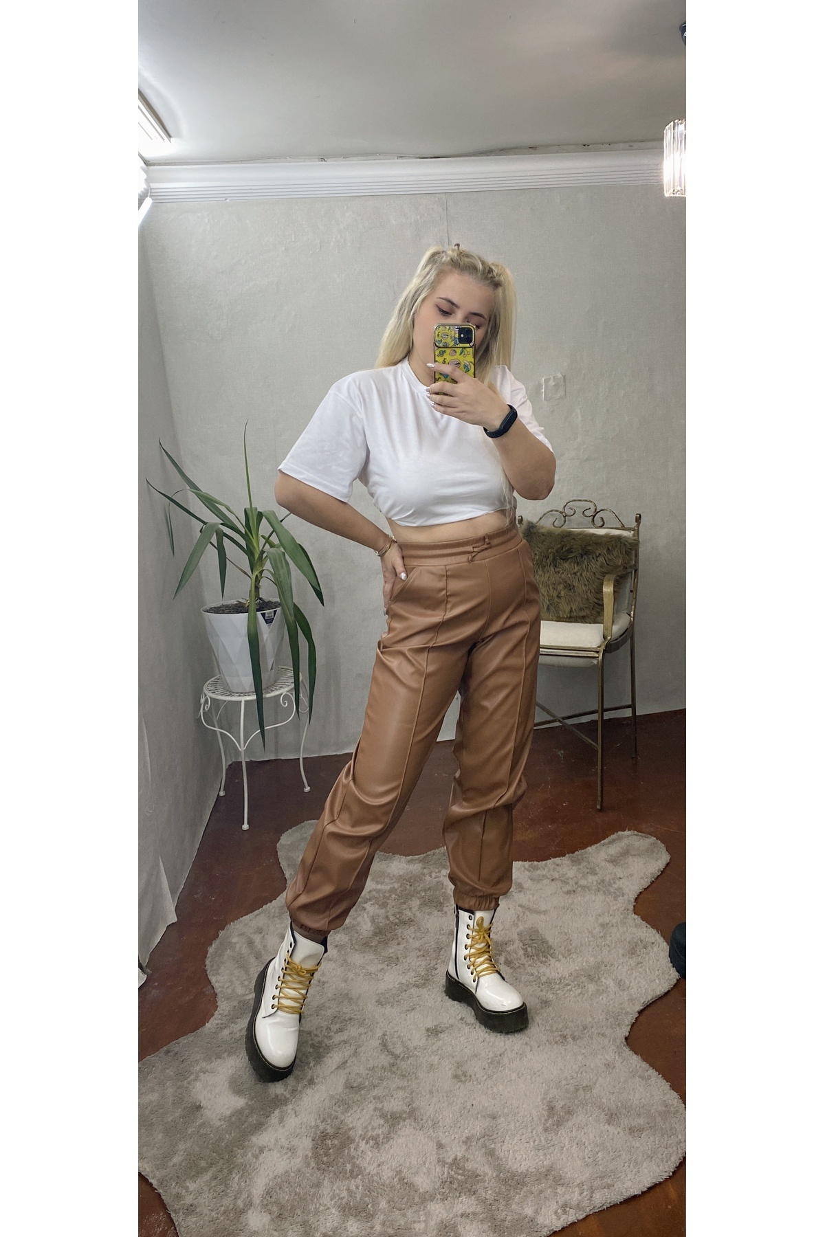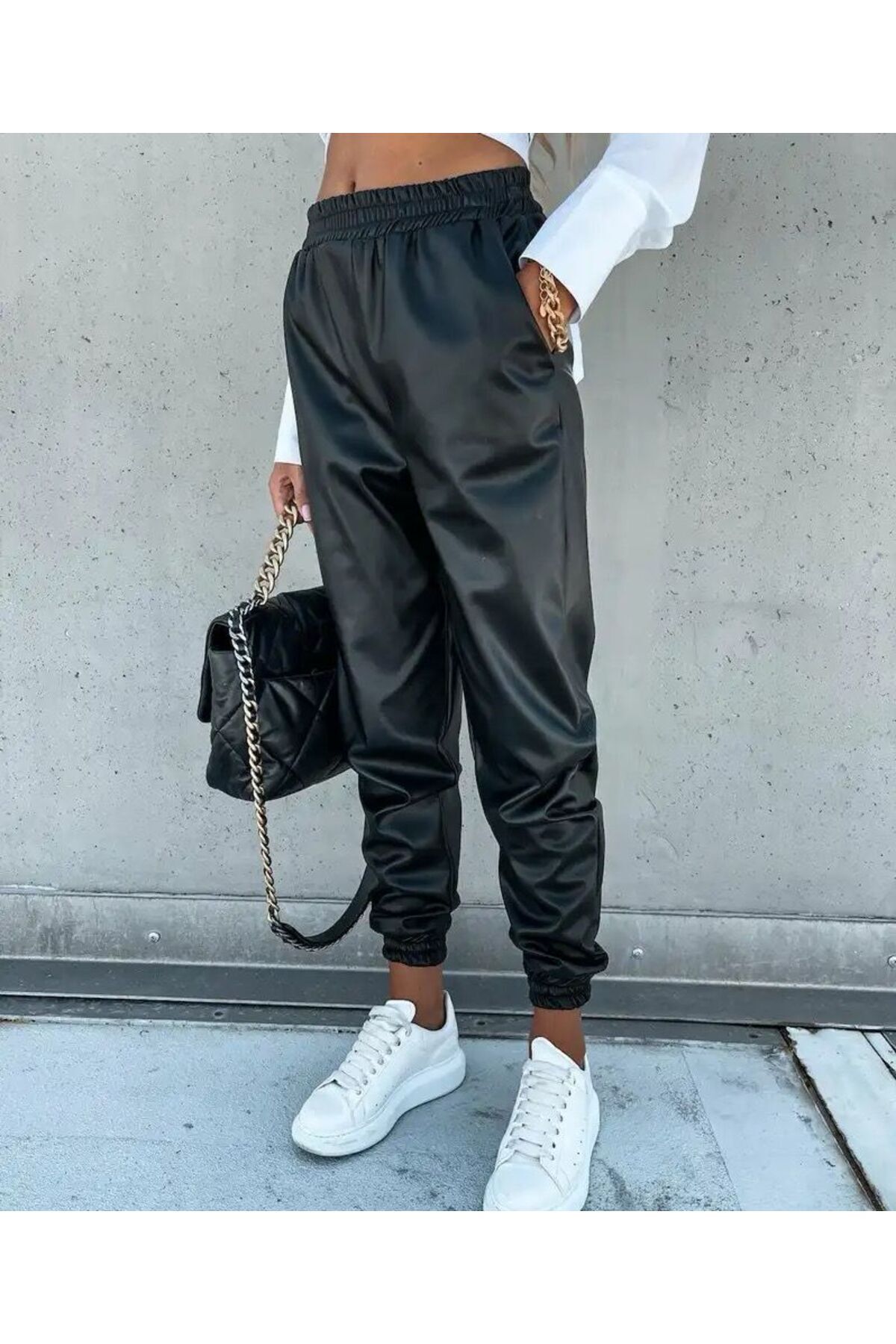 Düz Kesim Beli Lastikli Siyah Deri Pantolon Düz Kesim Beli Lastikli Siyah Deri Pantolon Asl4989