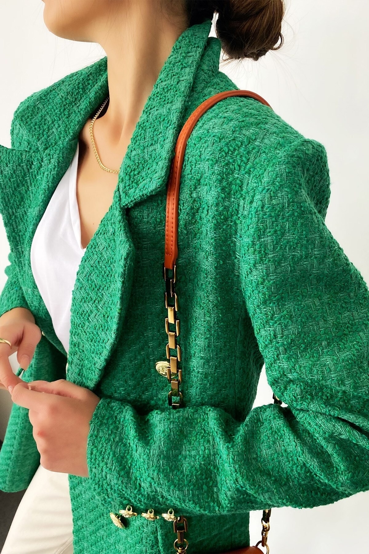 Yakası Püsküllü Düğmeli Tüvit Blazer Ceket - Yeşil Yakası Püsküllü Düğmeli Tüvit Blazer Ceket - Yeşil 20231538 L