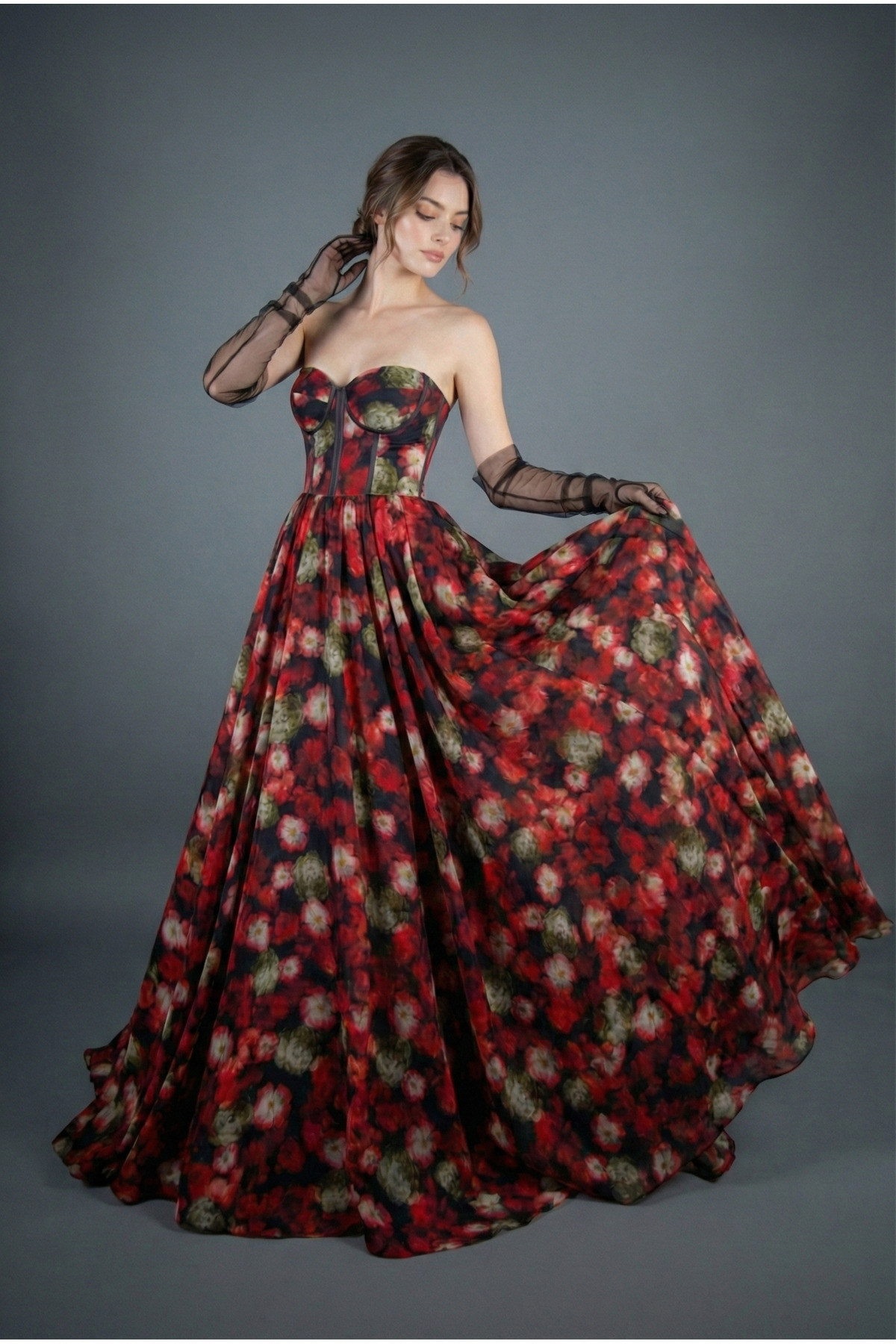 Siyah Üzerine Kırmızı Çiçek Detaylı Sırtı Bağcıklı İpek Şifon Nışanlık, Abiye Elbise Siyah Üzerine Kırmızı Çiçek Detaylı Sırtı Bağcıklı İpek Şifon Nışanlık, Abiye Elbise C0101 S/M