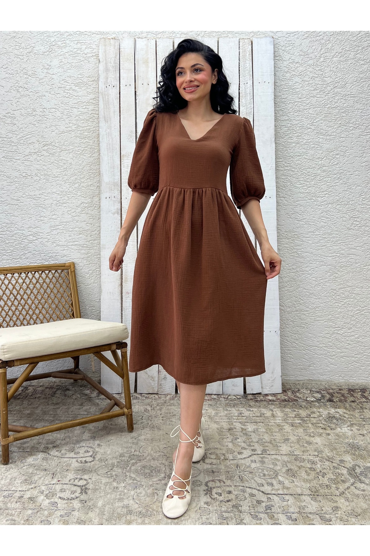 Kahverengi Karpuz Kol Kloş Midi Boy Krep Elbise Kahverengi Karpuz Kol Kloş Midi Boy Krep Elbise KCGM11824 3XL