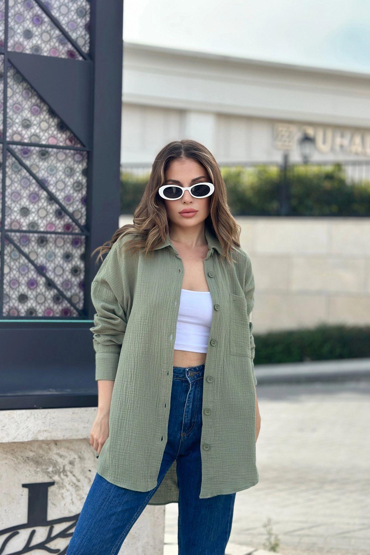 Kadın Haki İthal Müslin Kumaş, Cepli Uzun Ve Salaş Tunik Gömlek Kadın Haki İthal Müslin Kumaş, Cepli Uzun Ve Salaş Tunik Gömlek NY3443 42