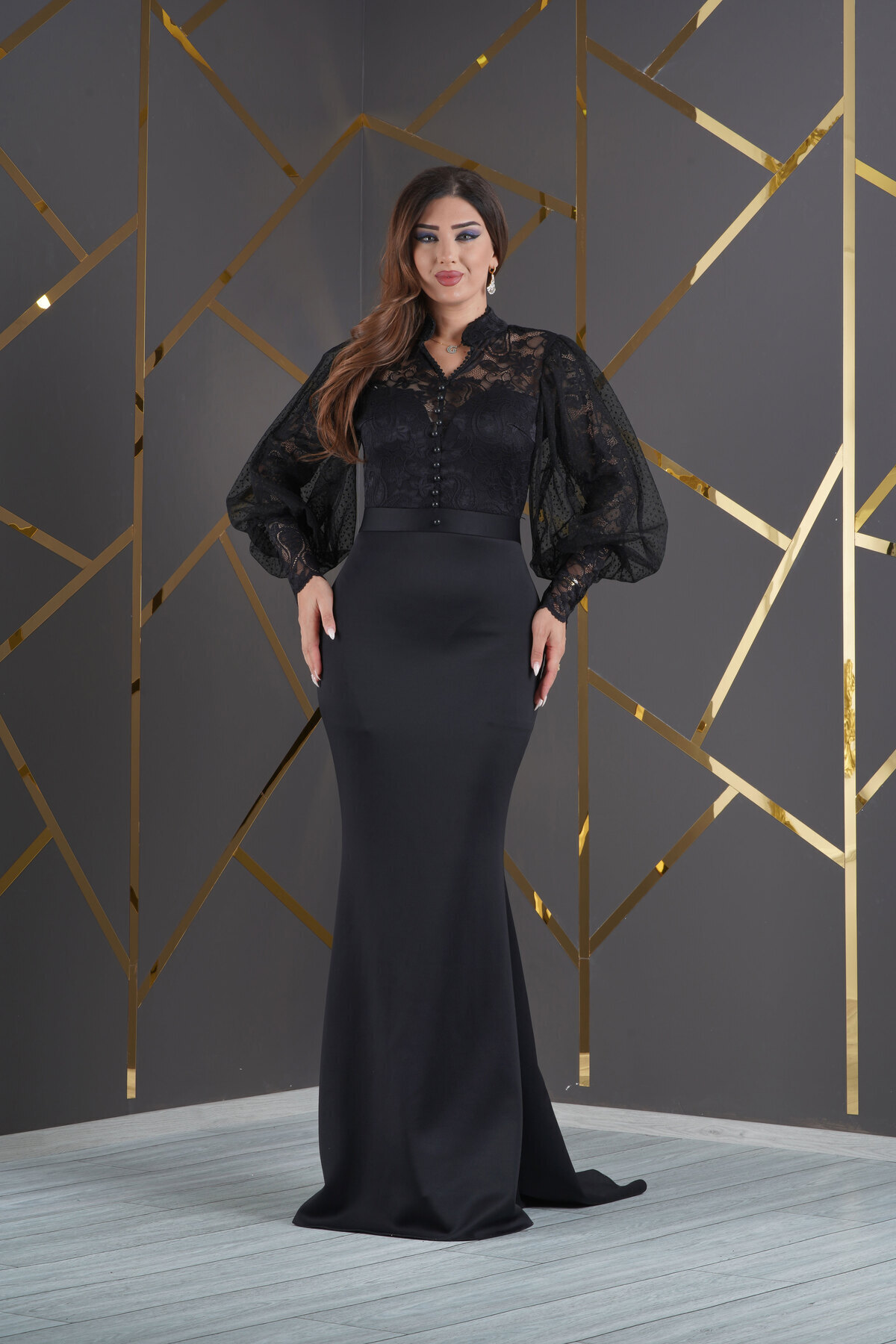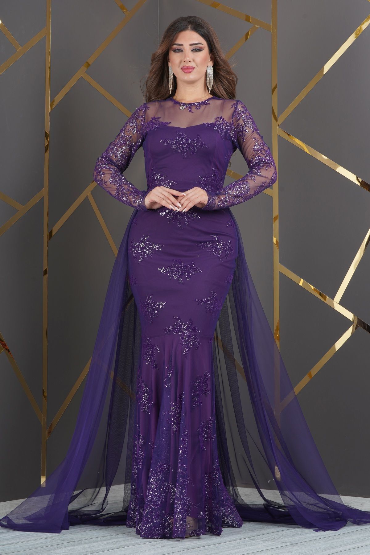Esnek Tül Üzerine Flok Baskılı Uzun Balık Elbise Abiye Esnek Tül Üzerine Flok Baskılı Uzun Balık Elbise Abiye 8718 54