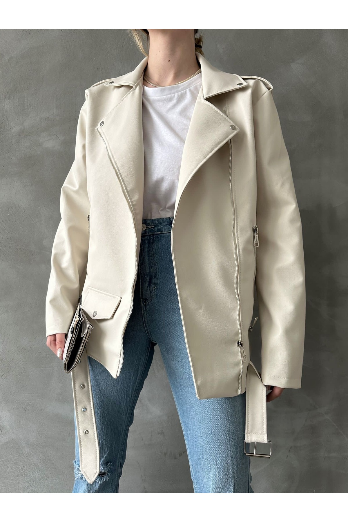 Kadın Oversize Biker Deri Ceket Kadın Oversize Biker Deri Ceket DD6134 XL
