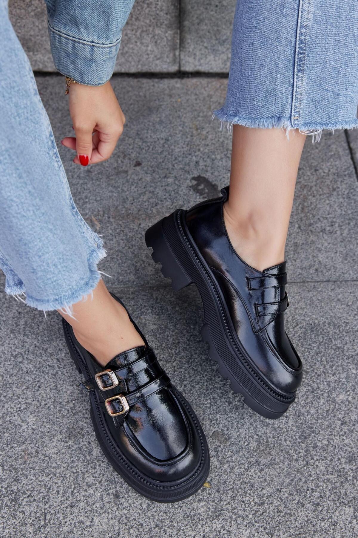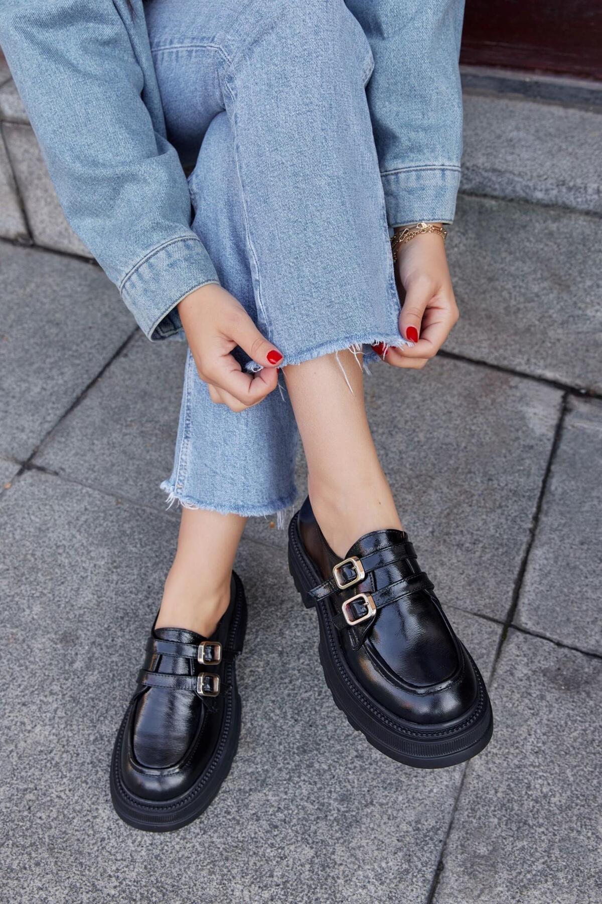 Belly Siyah Rugan Hakiki Deri Kalın Tabanlı Kadın Loafer Belly Siyah Rugan Hakiki Deri Kalın Tabanlı Kadın Loafer 418-7313 40