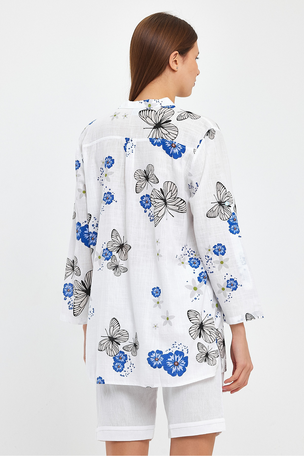 Kelebek Desenli Keten Bluz - Yarım Pat - 1544 Kelebek Desenli Keten Bluz - Yarım Pat - 1544 HEDB 3XL