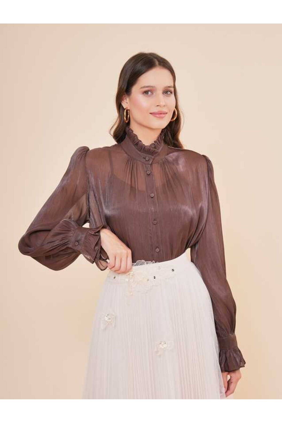 Dantel Detaylı Saten Dik Yaka Uzun Kollu Ekru Gömlek 35443 Dantel Detaylı Saten Dik Yaka Uzun Kollu Ekru Gömlek 35443 2220135443-030 44