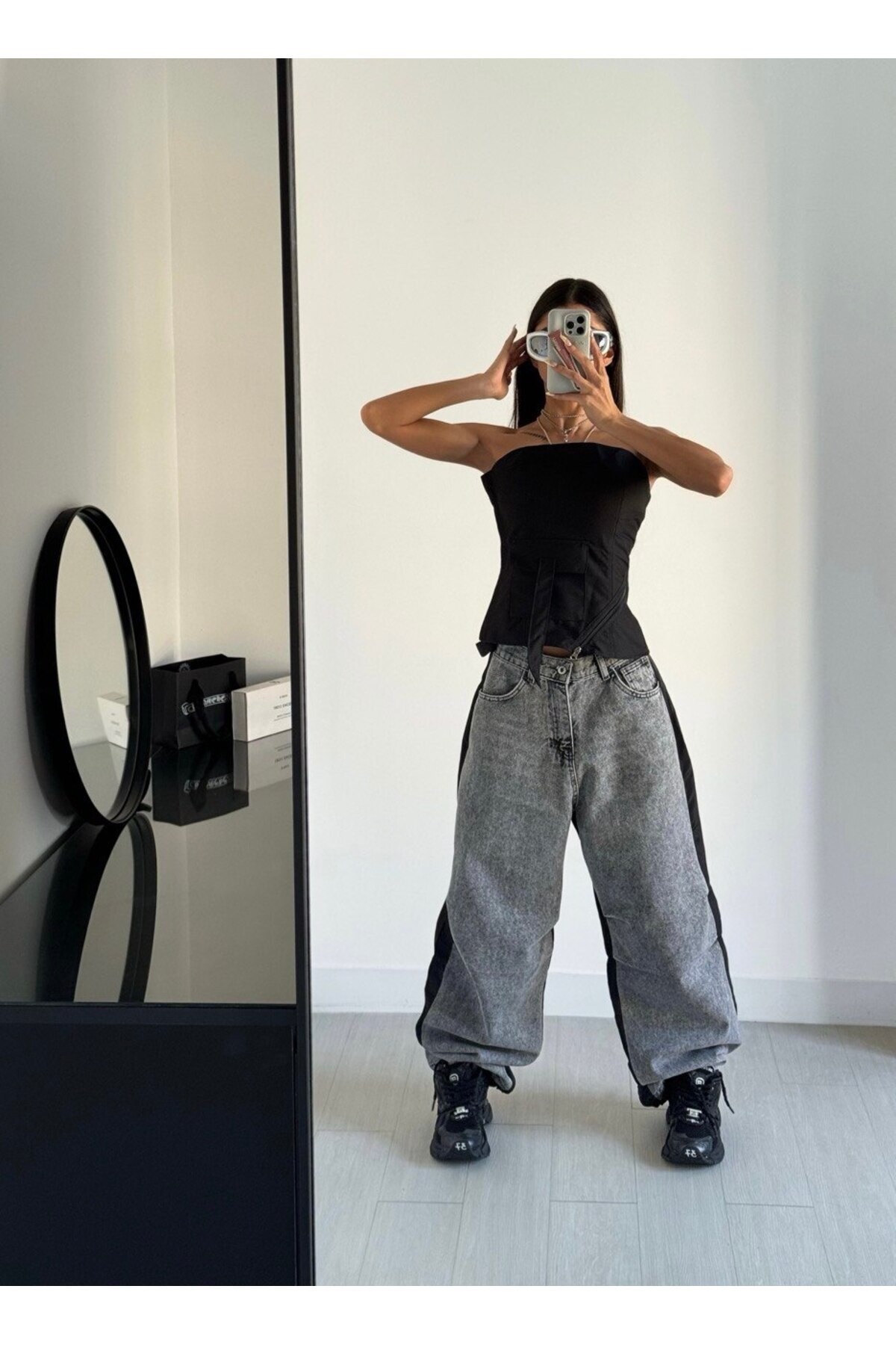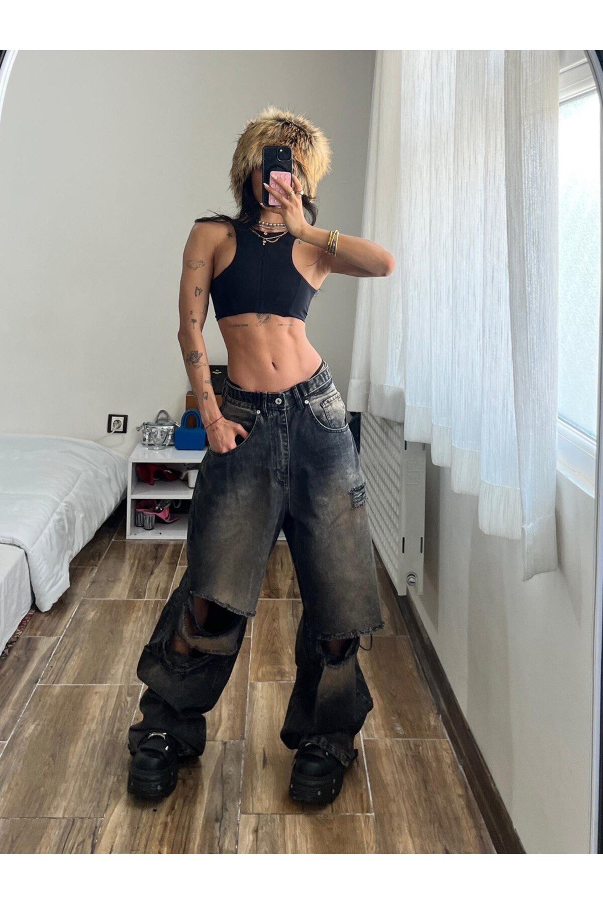 Yırtmaç Detaylı Baggy Kesim Mavi Yıkamalı Kot Pantolon Yırtmaç Detaylı Baggy Kesim Mavi Yıkamalı Kot Pantolon ALALIEN05ML XS/34