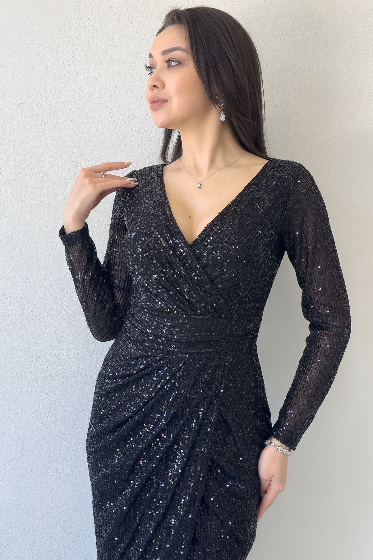 Kadın Siyah Payet Tasarım Kruvaze Yaka Uzun Kollu Yeni Sezon Büyük Beden Abiye Elbise Kadın Siyah Payet Tasarım Kruvaze Yaka Uzun Kollu Yeni Sezon Büyük Beden Abiye Elbise ED0002 50