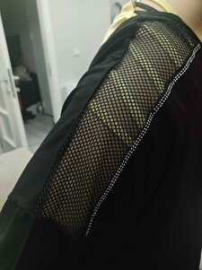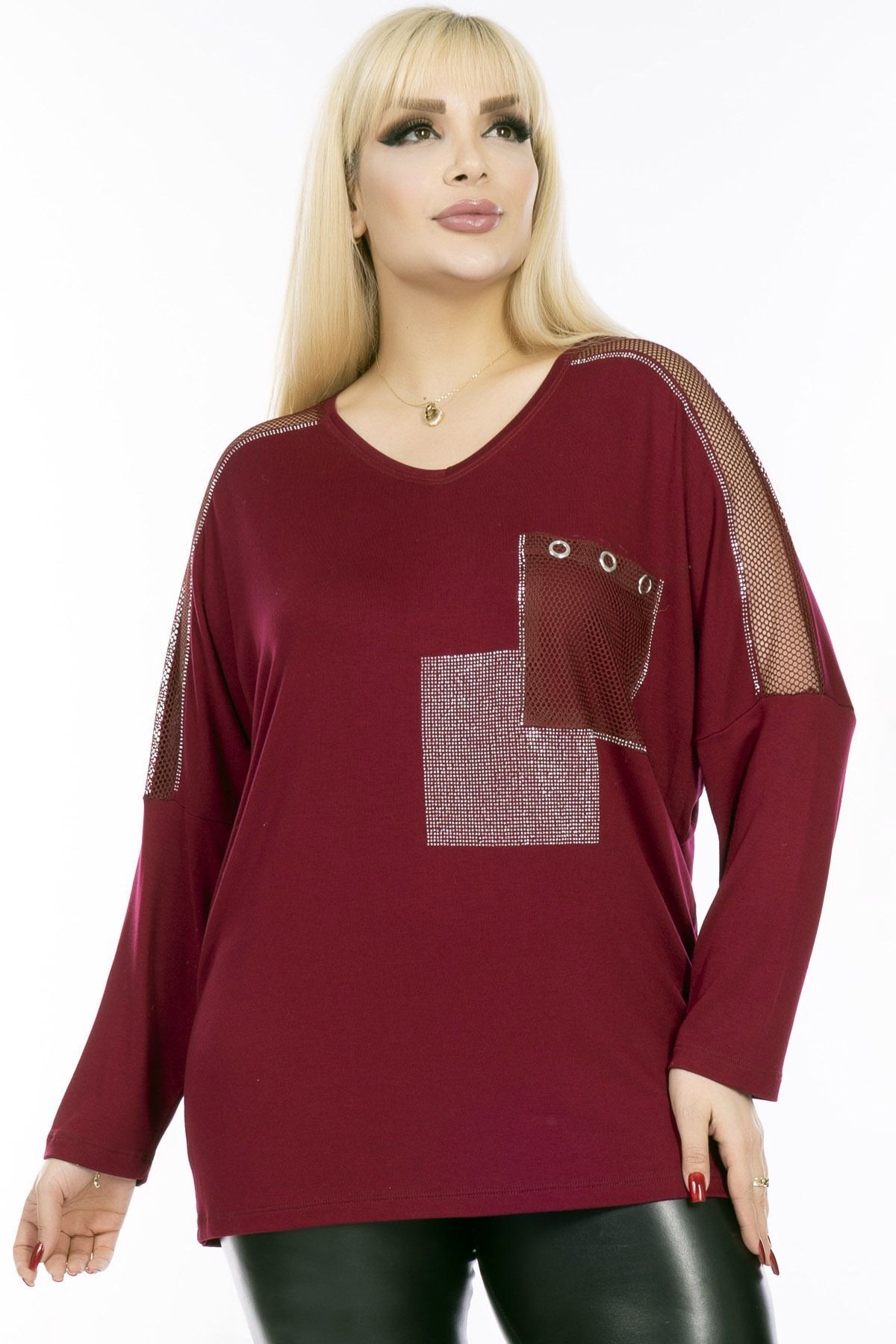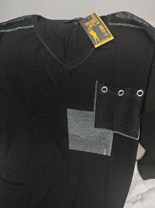 V Yakalı Cebi ve Kolları File Detaylı Taş İşlemeli Uzun Kollu Rahat ve Dökümlü Esnek Bluz V Yakalı Cebi ve Kolları File Detaylı Taş İşlemeli Uzun Kollu Rahat ve Dökümlü Esnek Bluz KHE-00151 54-56