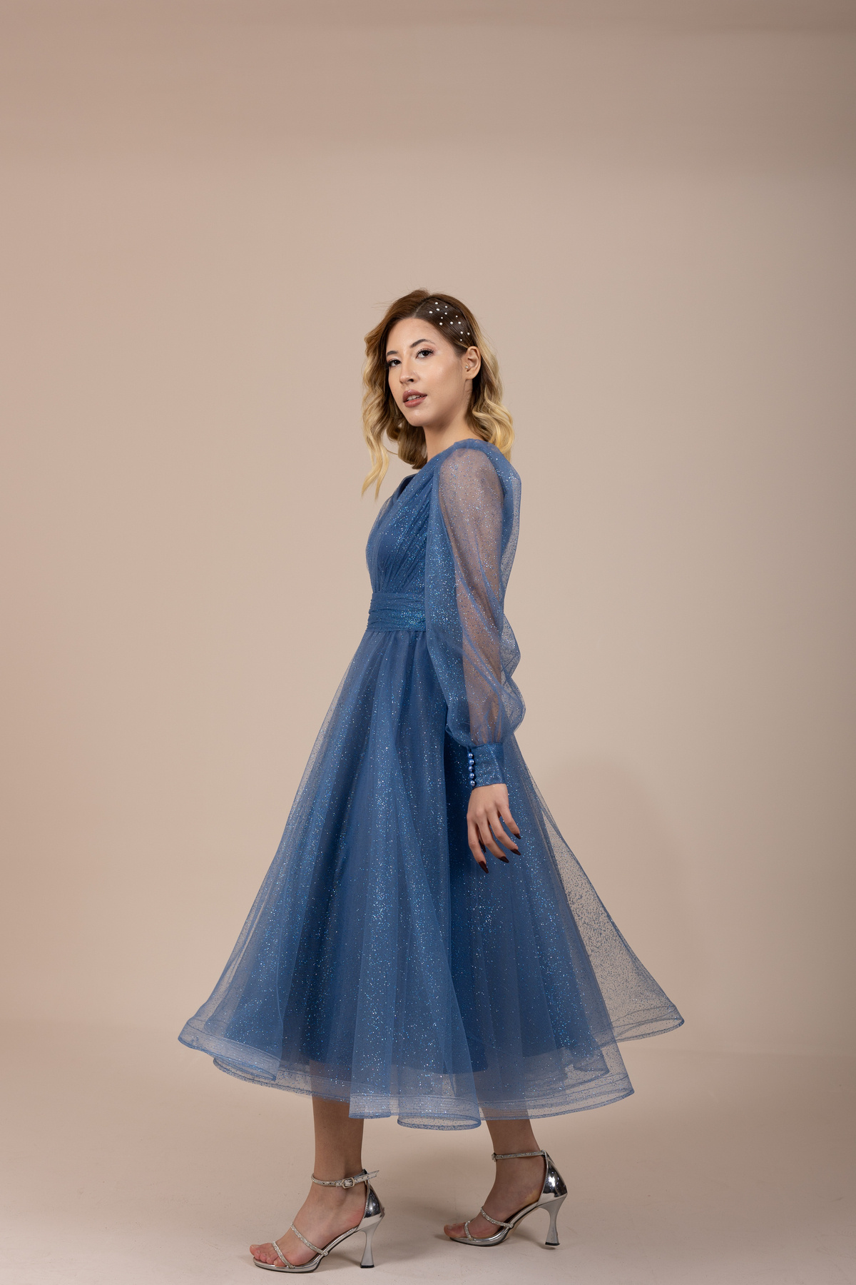 Aurora V Yaka Simli Tül Midi Elbise Aurora V Yaka Simli Tül Midi Elbise BBAURORA 42