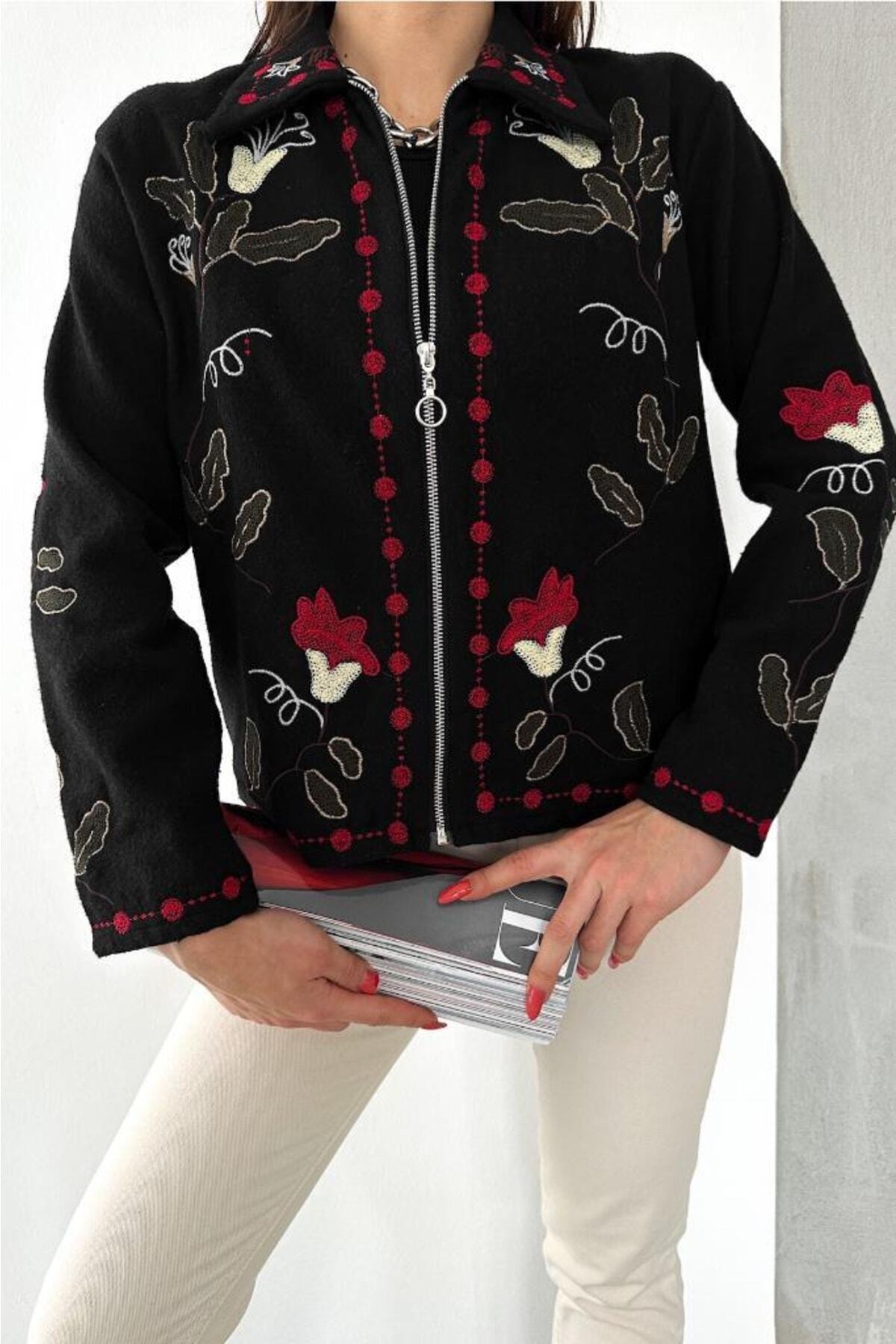 Siyah Nakış İşlemeli İnce Ceket Bilekleri Lastikli Önden Bağlamalı Püsküllü Siyah Nakış İşlemeli İnce Ceket Bilekleri Lastikli Önden Bağlamalı Püsküllü 5625 L