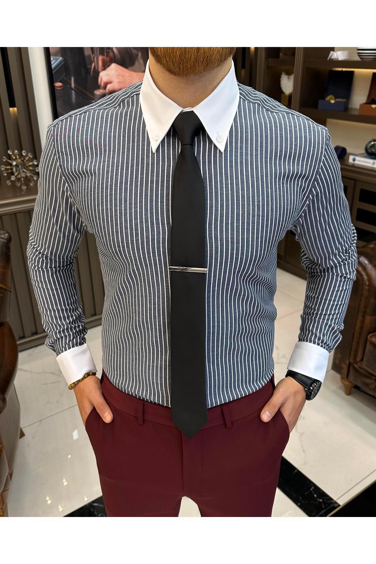 İtalyan stil çizgili düğme yaka likralı erkek gömlek lacivert T11141 İtalyan stil çizgili düğme yaka likralı erkek gömlek lacivert T11141 3XL