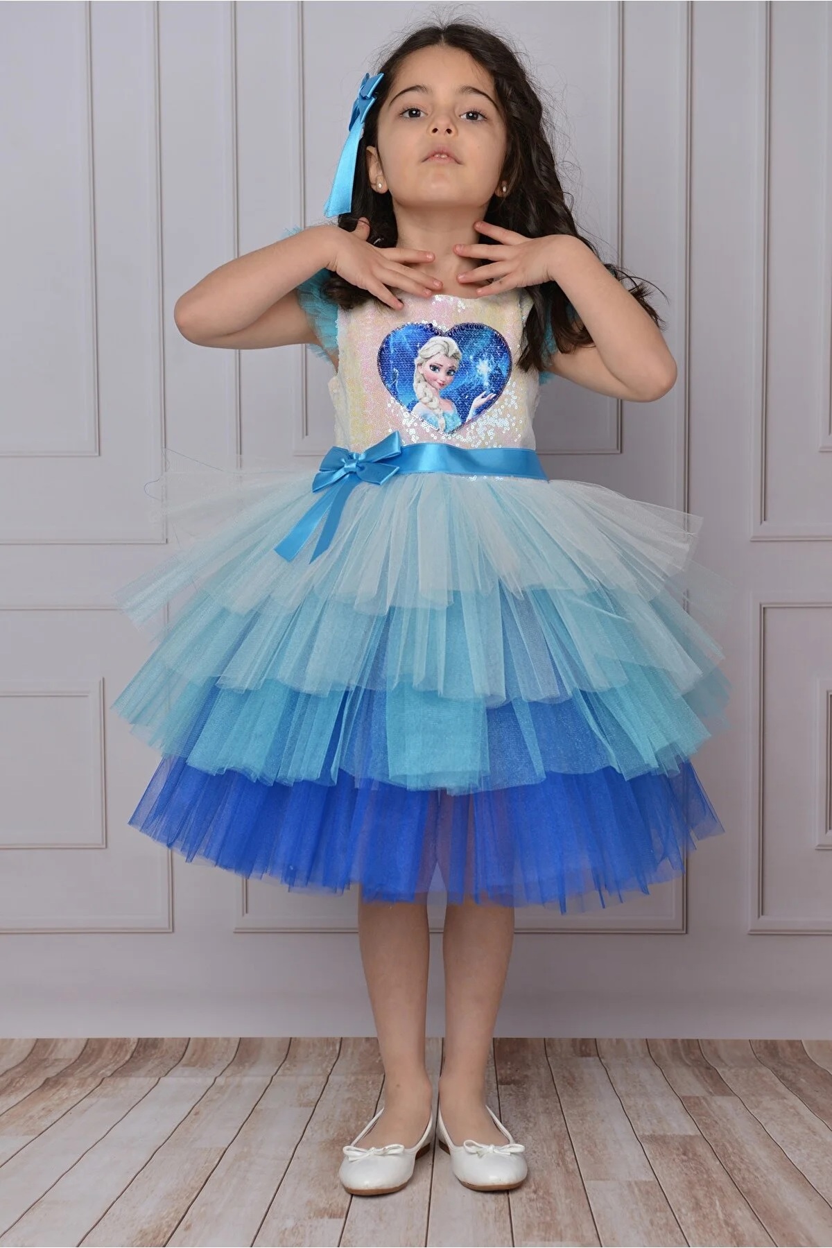 Mavi Elsa Balon Kol Kız Çocuk Abiye Elbise Mavi Elsa Balon Kol Kız Çocuk Abiye Elbise shls1 2-4 Yaş