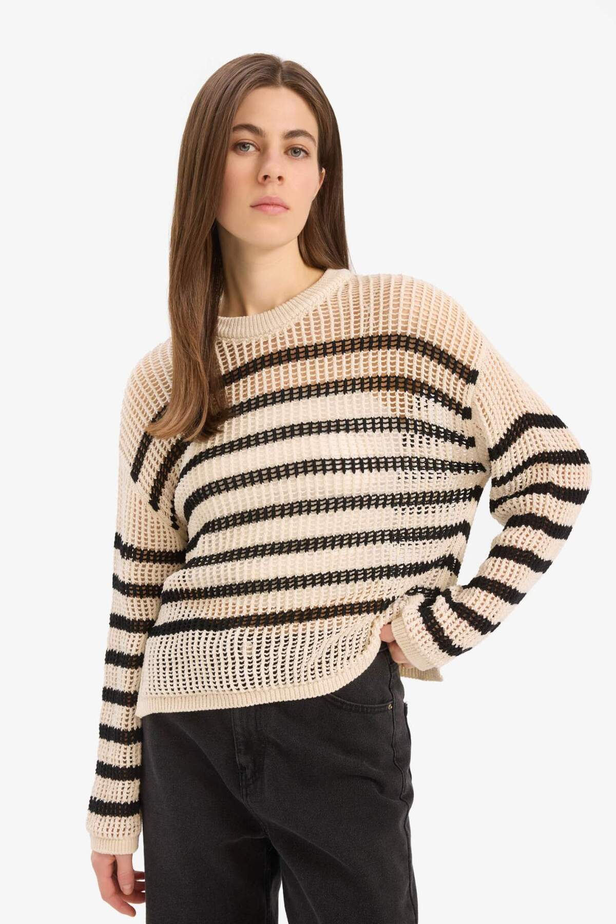 Oversize Geniş Kalıp Çizgili Bisiklet Yaka Ajur Triko Kazak C2564AX24SP Oversize Geniş Kalıp Çizgili Bisiklet Yaka Ajur Triko Kazak C2564AX24SP XL