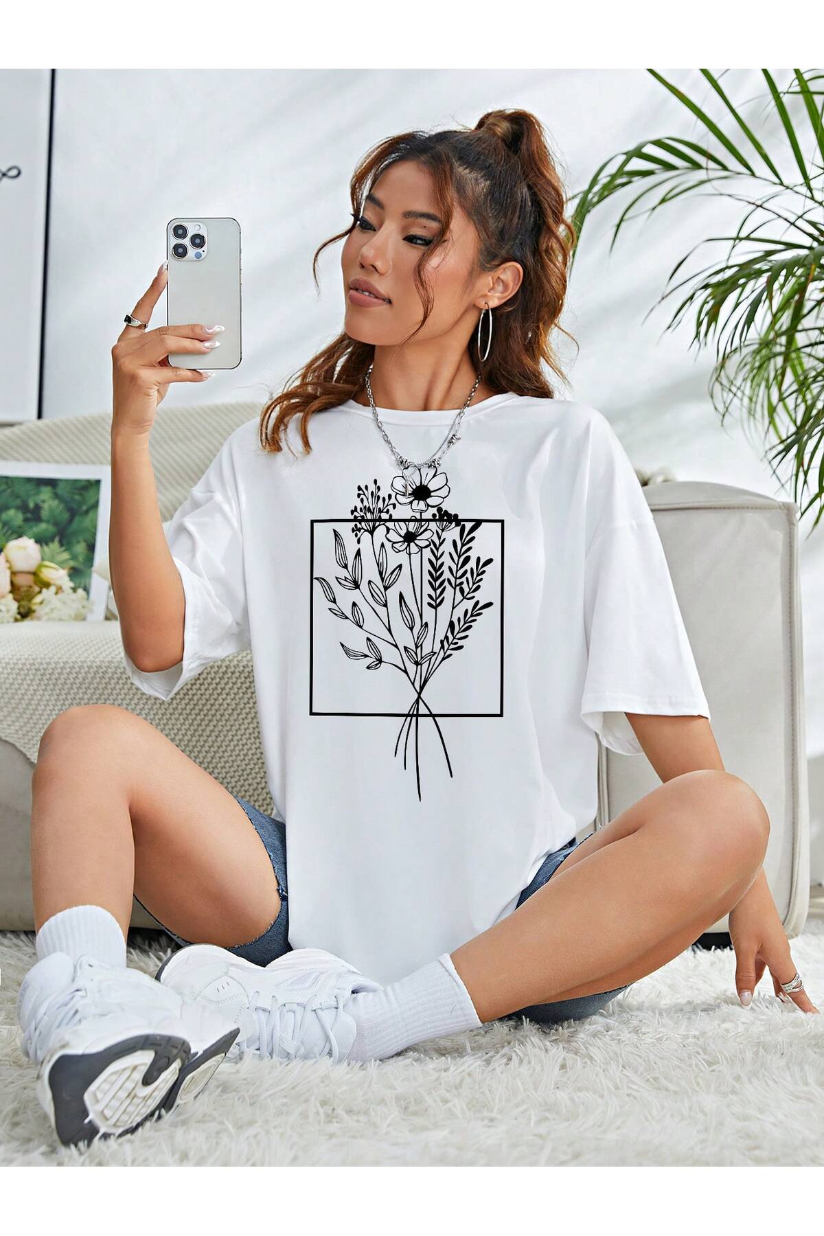 Çiçek Desenli Düşük Omuz Tişört Çiçek Desenli Düşük Omuz Tişört Tarzsokak-Tshirt-SheB-5601 XL