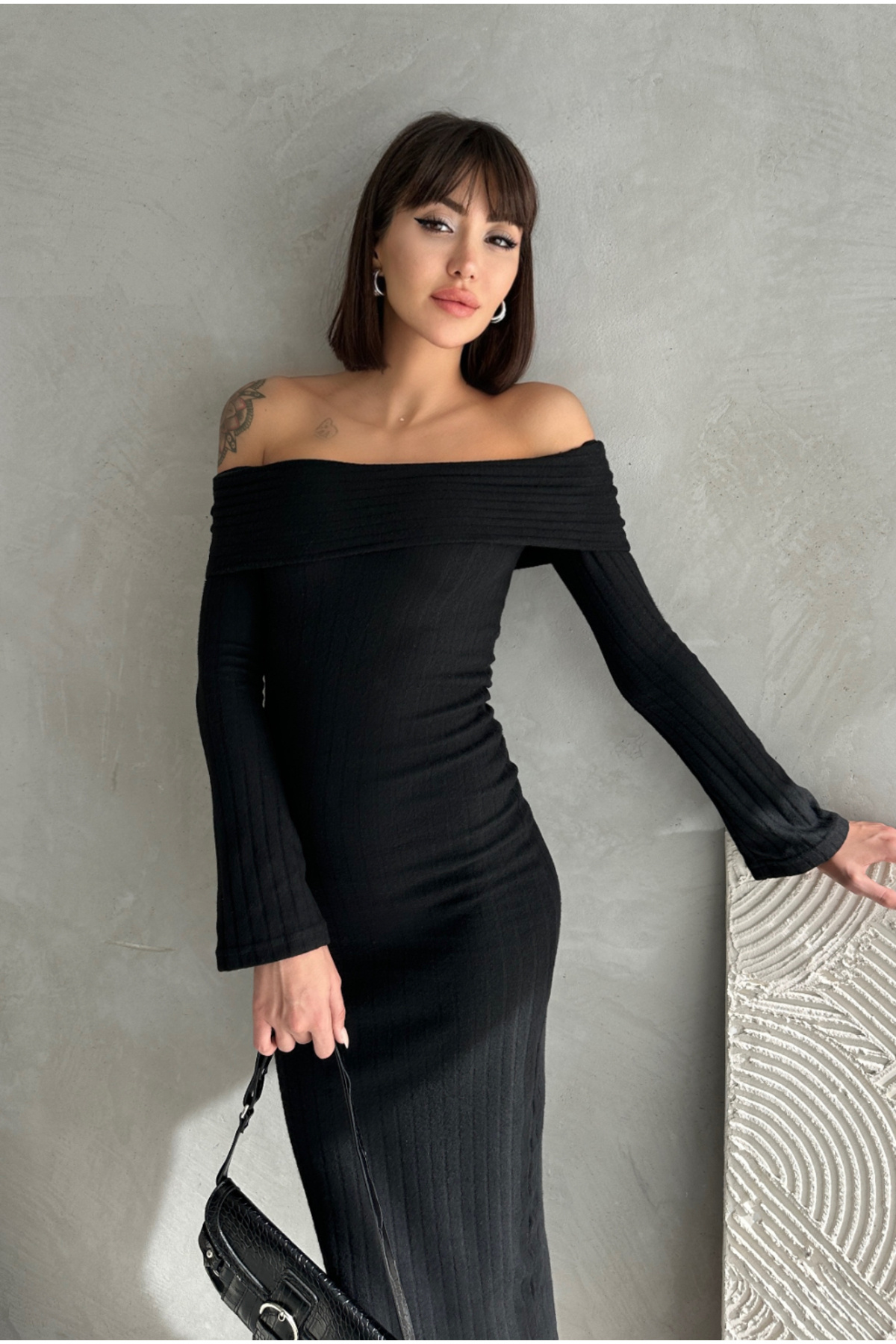 Siyah Kare Yaka Uzun Kollu Esnek Uzun Elbise Siyah Kare Yaka Uzun Kollu Esnek Uzun Elbise wft2884e L