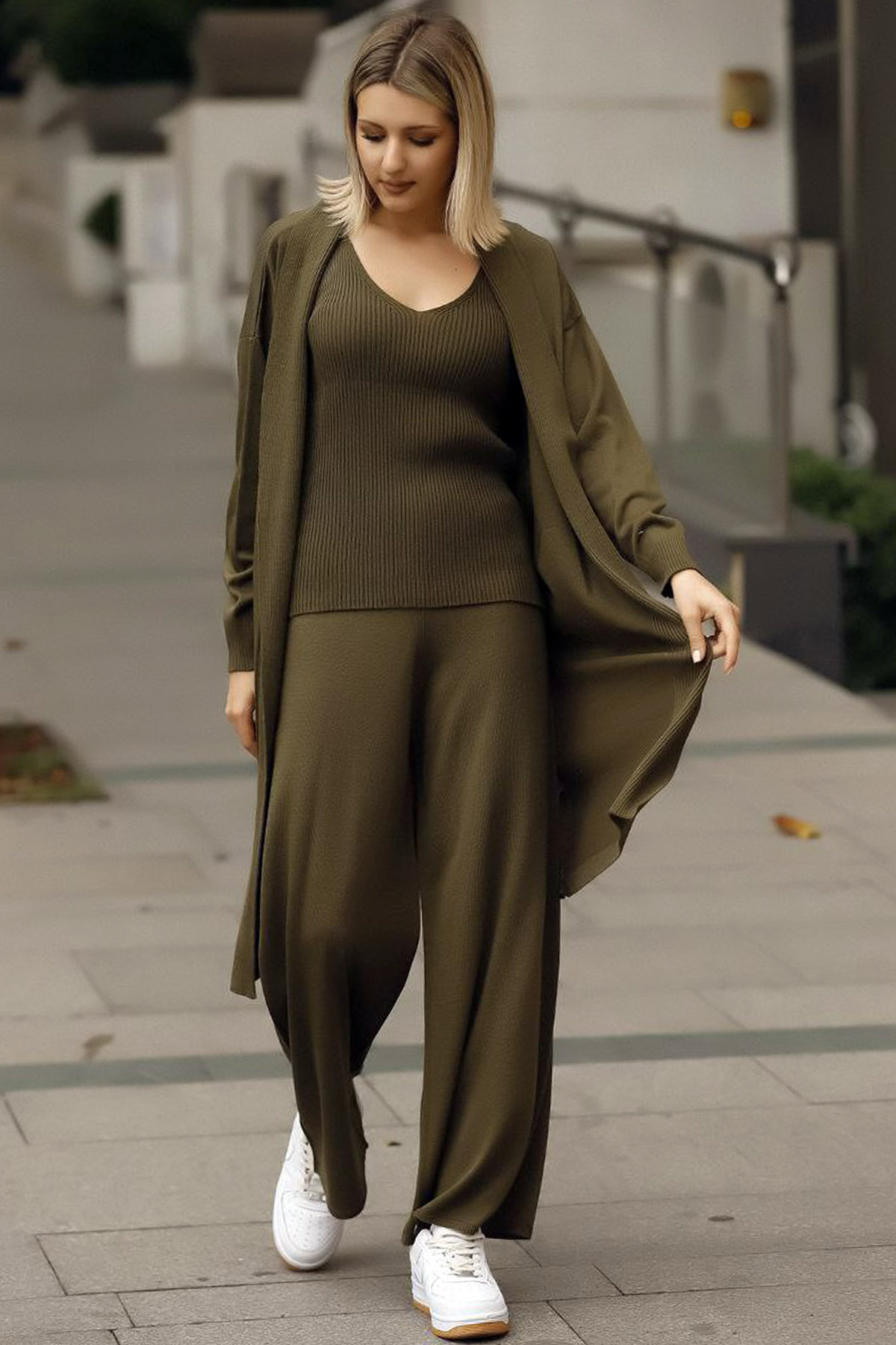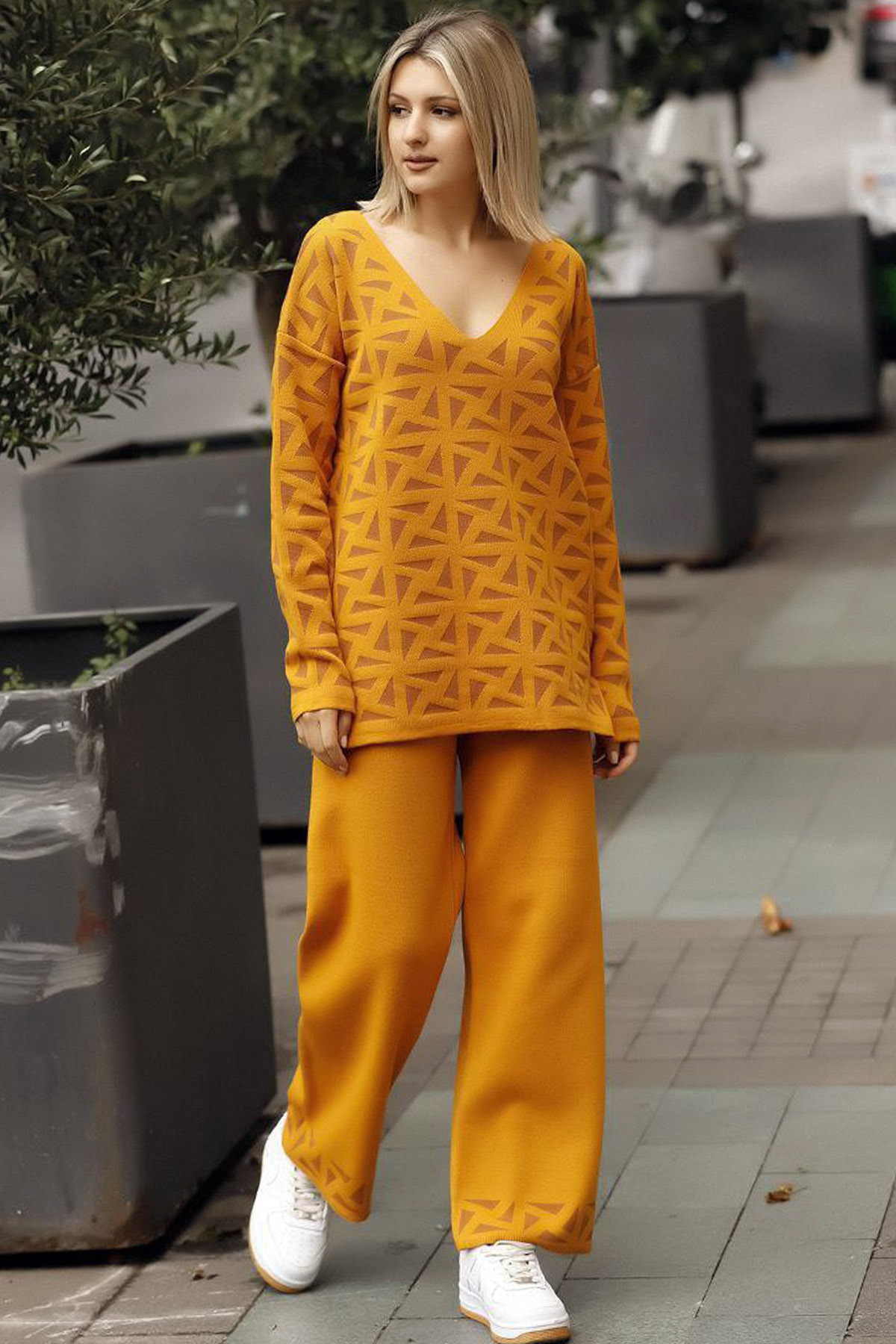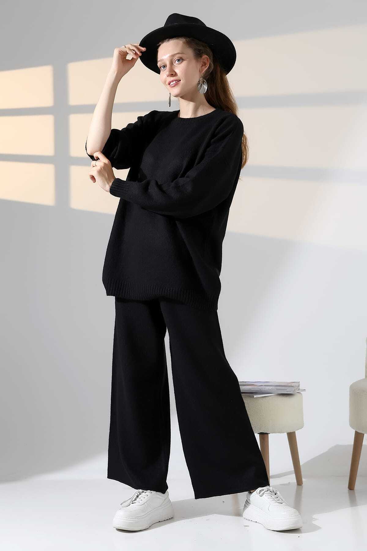 V Yaka Uzun Kollu Bol Kesim Yırtmaçlı Kazak Beli Lastikli Düz Paça Pantolon Triko İkili Takım V Yaka Uzun Kollu Bol Kesim Yırtmaçlı Kazak Beli Lastikli Düz Paça Pantolon Triko İkili Takım ALCH-00022 XL