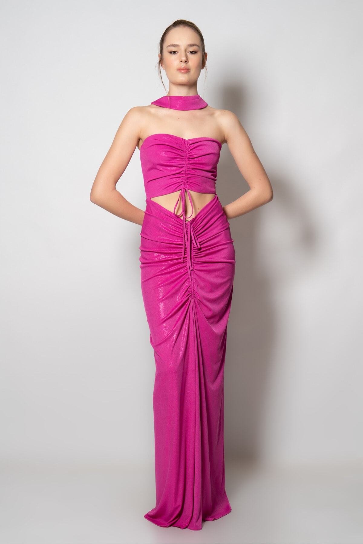 Tek kolu ve eteği ip büzgülü empirme şifon abiye elbise Tek kolu ve eteği ip büzgülü empirme şifon abiye elbise 7238 44
