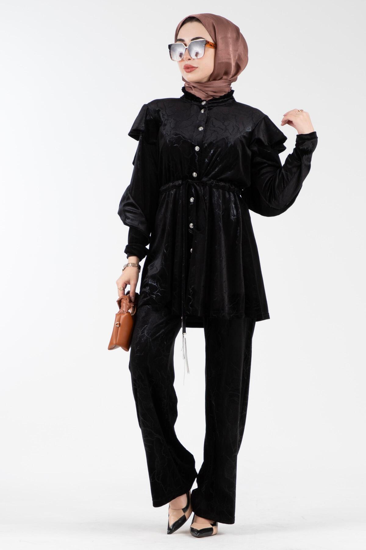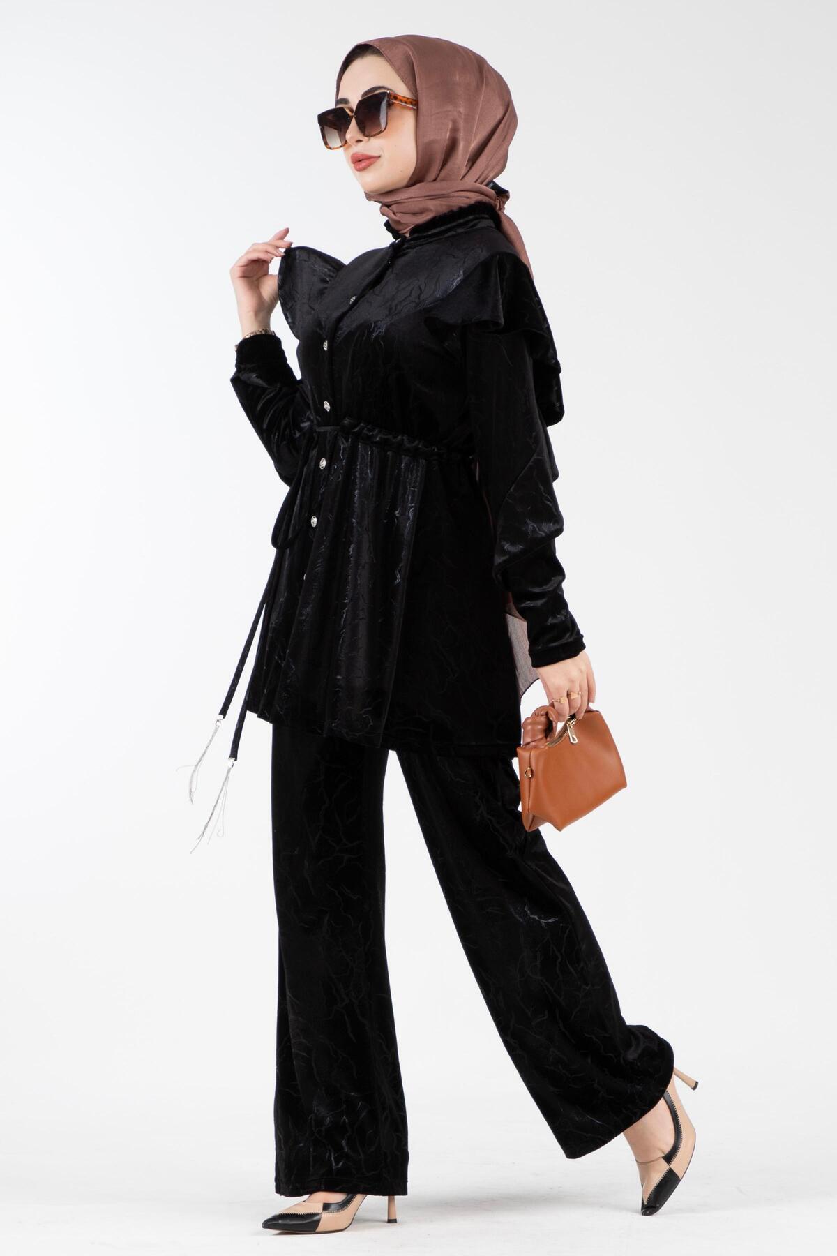 Omuzu Volanlı Kadife Takım-Siyah Omuzu Volanlı Kadife Takım-Siyah LA3718 44