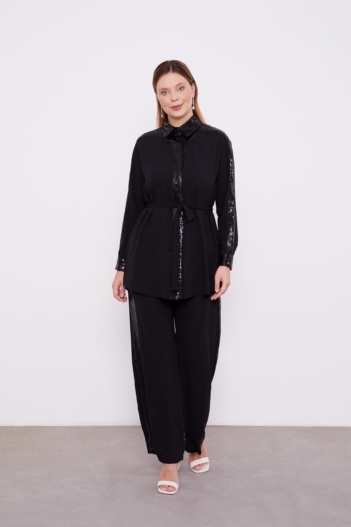 TAŞLI PÜSKÜL DETAYLI KUŞAKLI İKİLİ PANTOLONLU TAKIM 30288 TAŞLI PÜSKÜL DETAYLI KUŞAKLI İKİLİ PANTOLONLU TAKIM 30288 22YTKP0030288 44