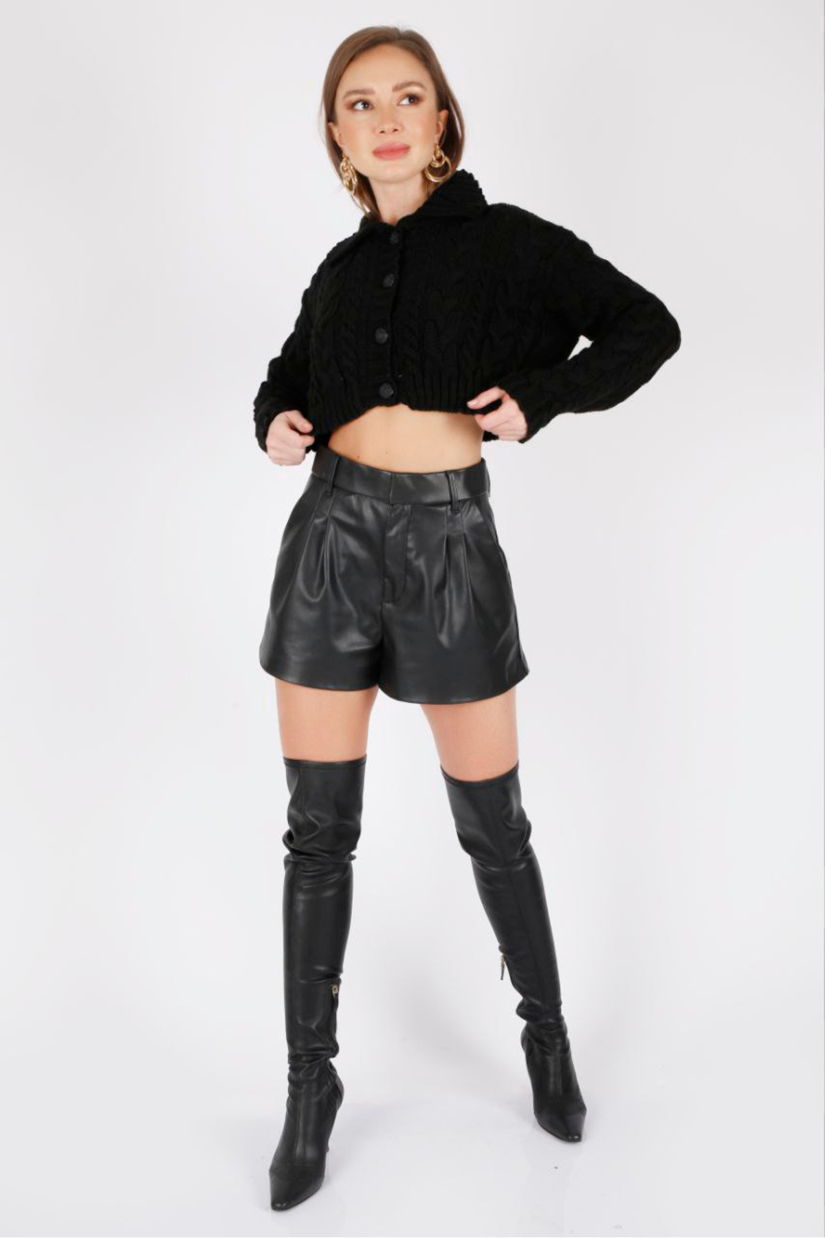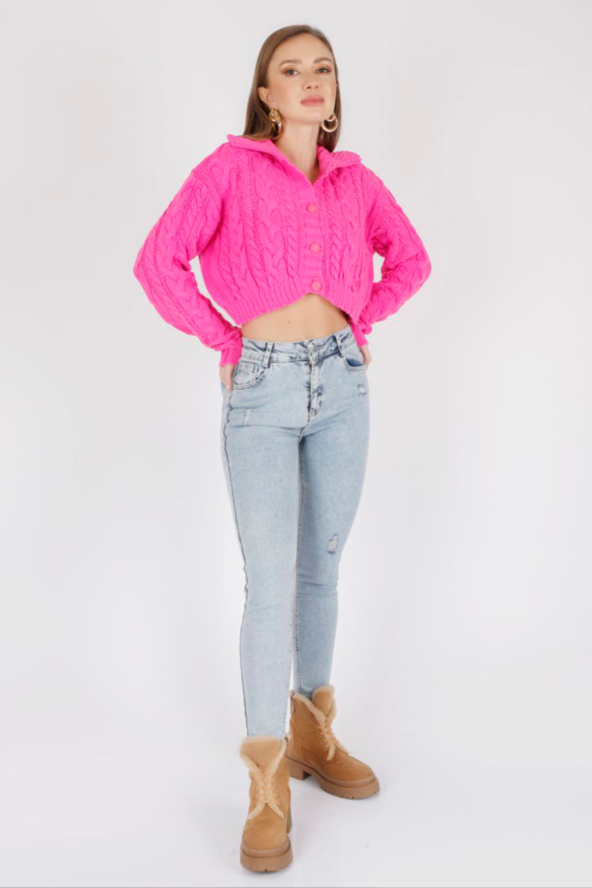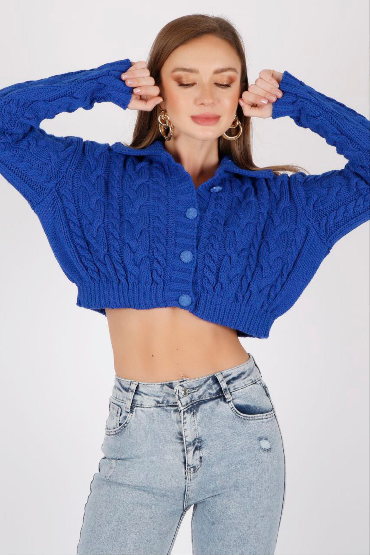 Polo Yaka Uzun Kollu Saç Örgülü Dört Düğmeli Crop Kısa Triko Hırka Polo Yaka Uzun Kollu Saç Örgülü Dört Düğmeli Crop Kısa Triko Hırka ALCH-00043 XL
