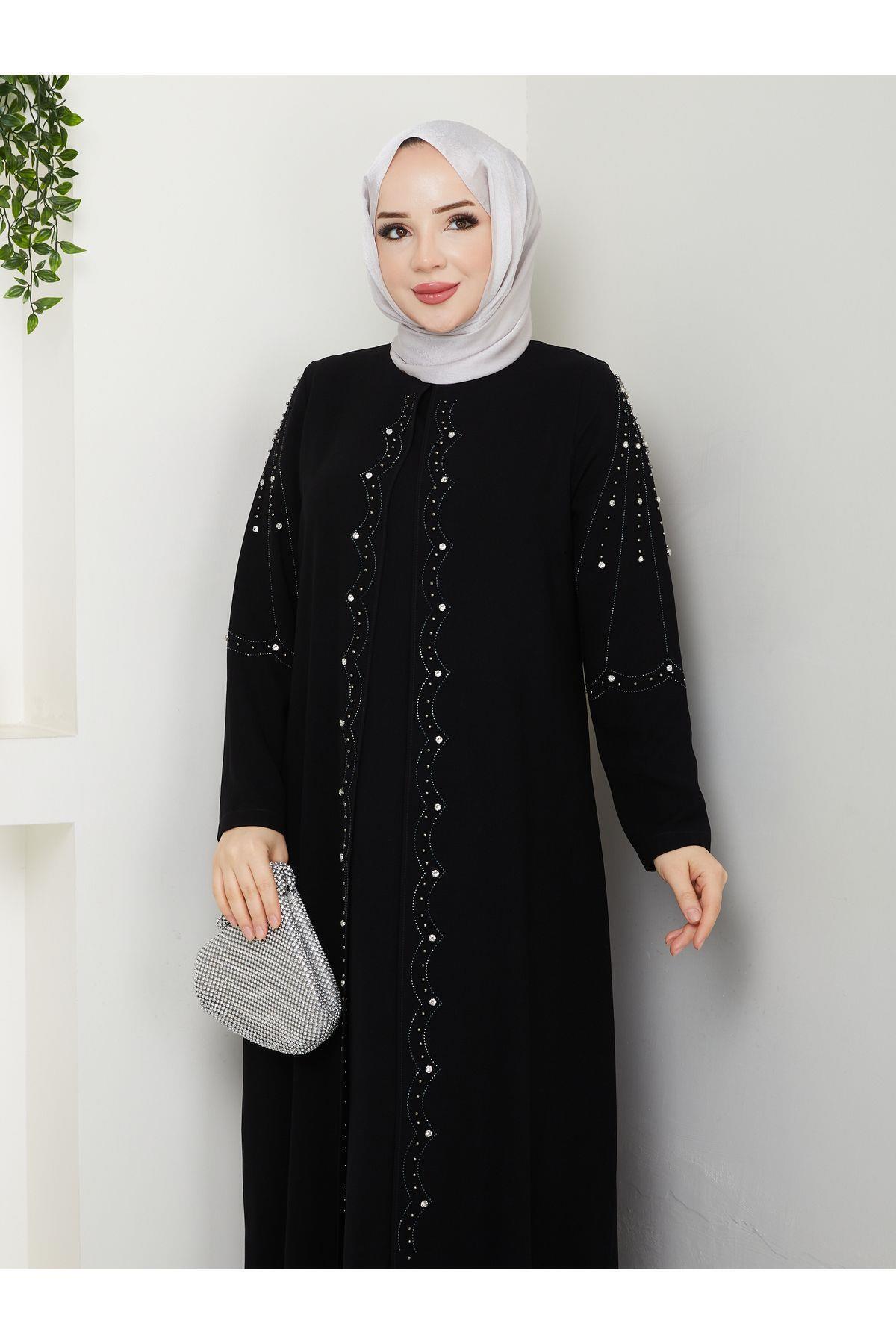 Büyük Beden Yaprak Taşlı Anne Elbisesi Siyah HM2350 Büyük Beden Yaprak Taşlı Anne Elbisesi Siyah HM2350 58