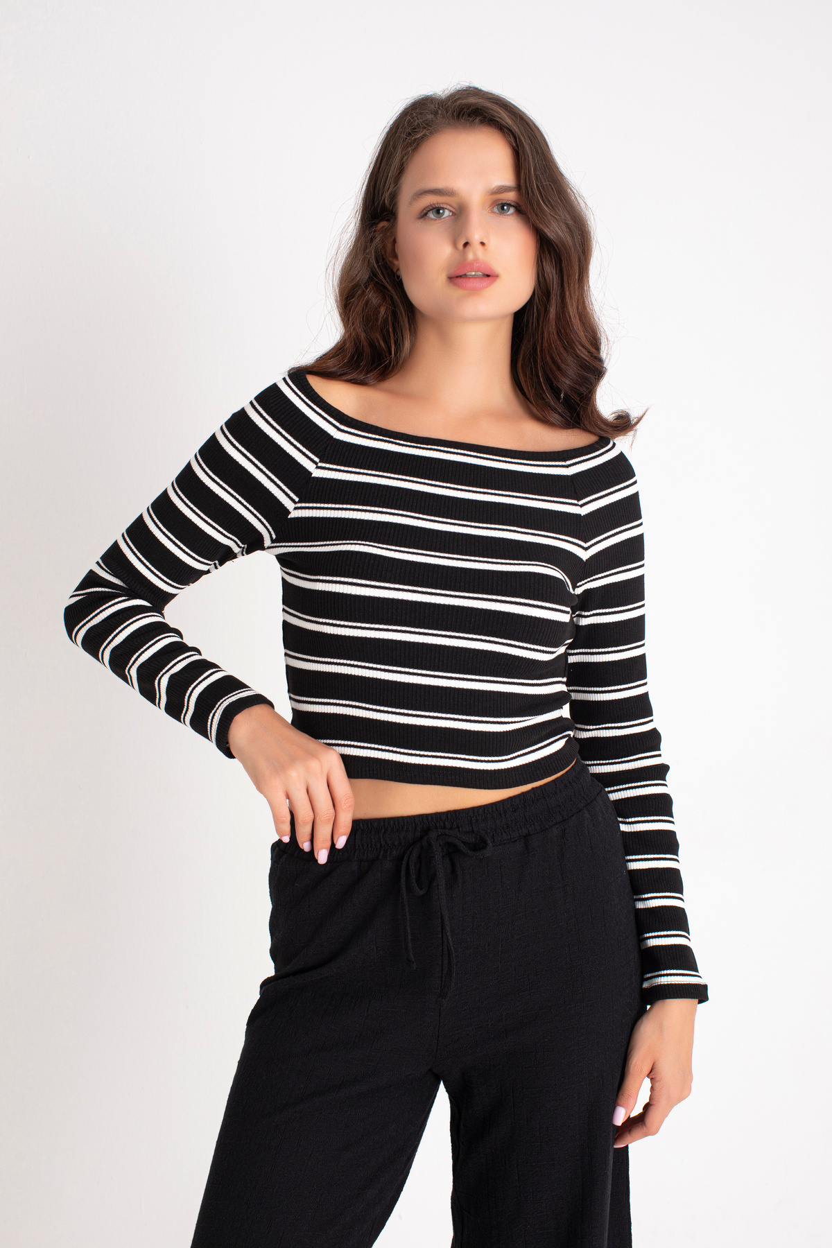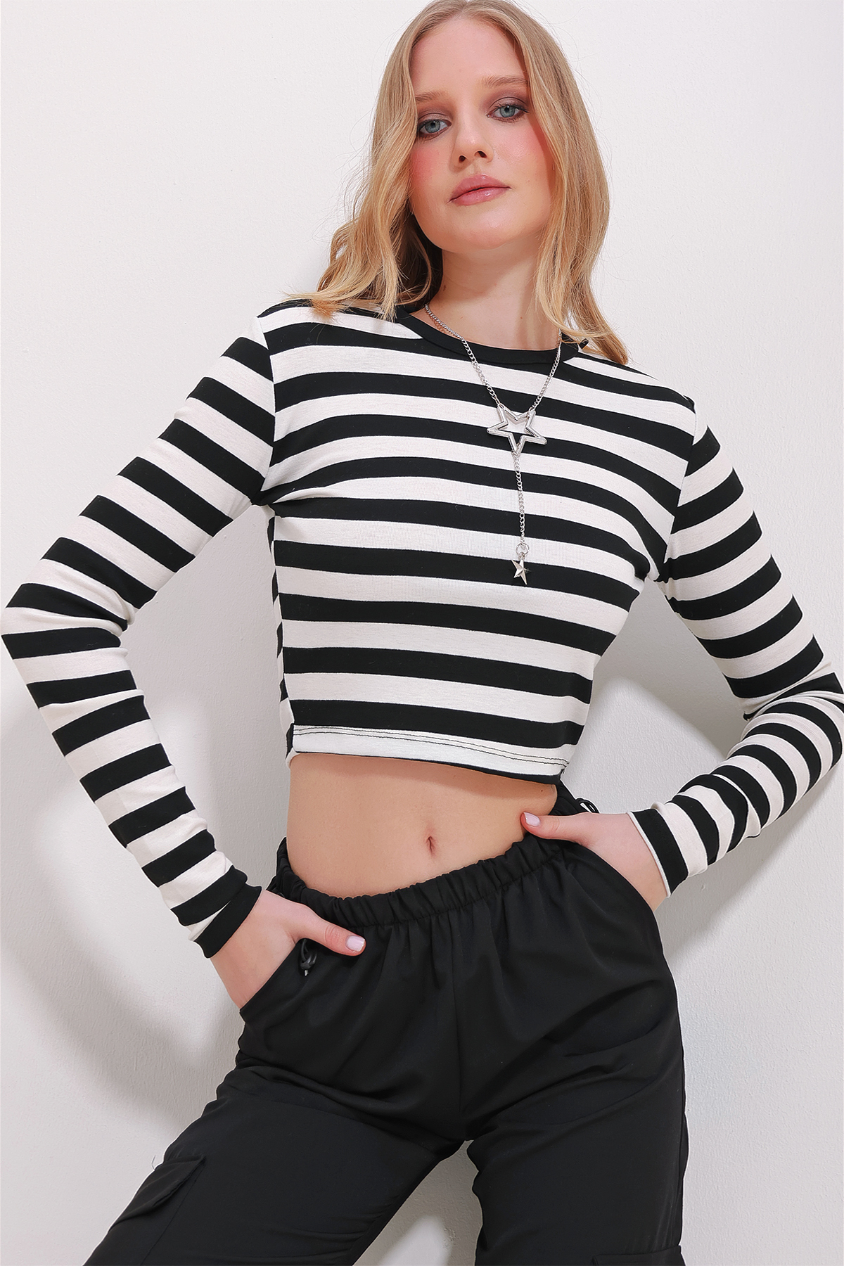 Kadın Siyah Beyaz Çıkarılabilir Kolyeli Çizgili Crop Örme Bluz AN00177 Kadın Siyah Beyaz Çıkarılabilir Kolyeli Çizgili Crop Örme Bluz AN00177 M