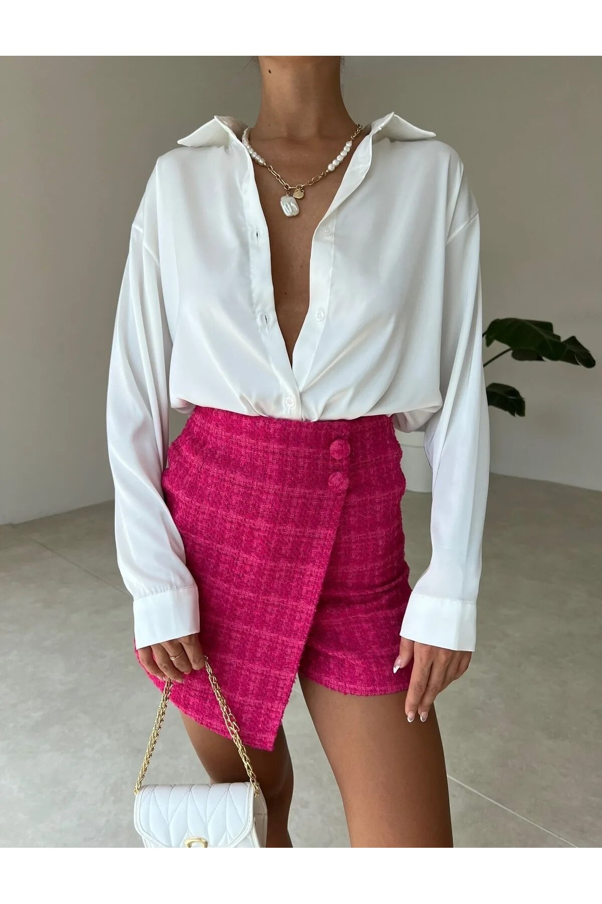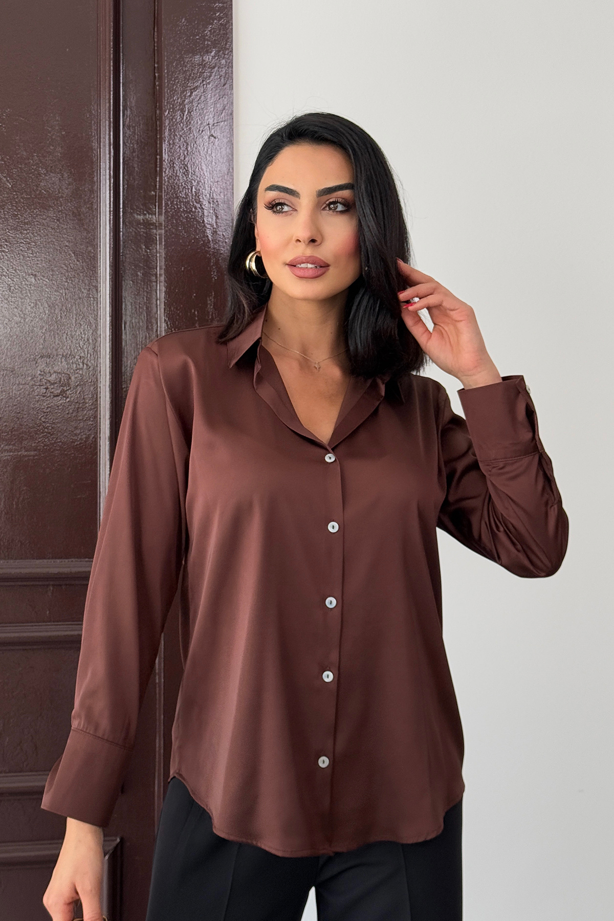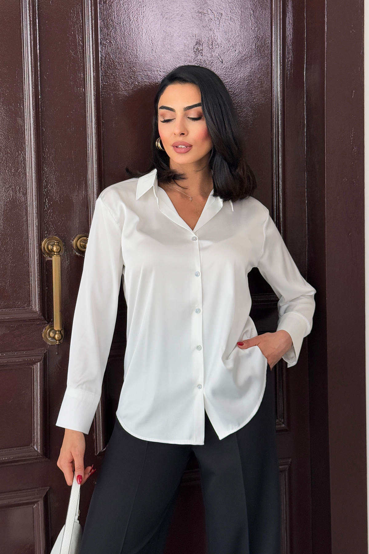 Beyaz Hafif Dökümlü Saten Gömlek Beyaz Hafif Dökümlü Saten Gömlek OC0000000389 L