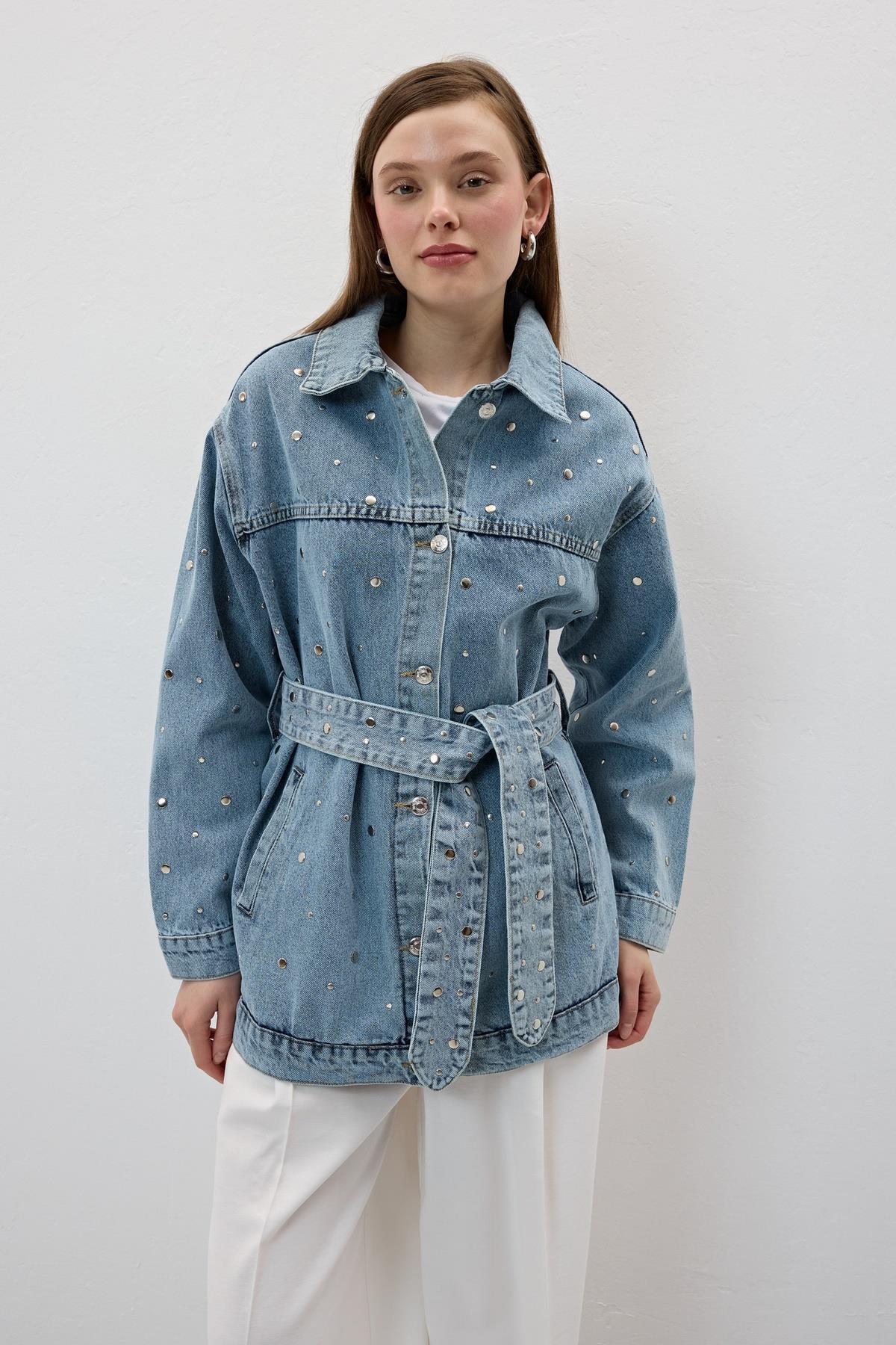 SAGİ Kadın Yakası Zımbalı Ara Boy Kuşak Kapamalı Kot Ceket SAGİ Kadın Yakası Zımbalı Ara Boy Kuşak Kapamalı Kot Ceket 741 L